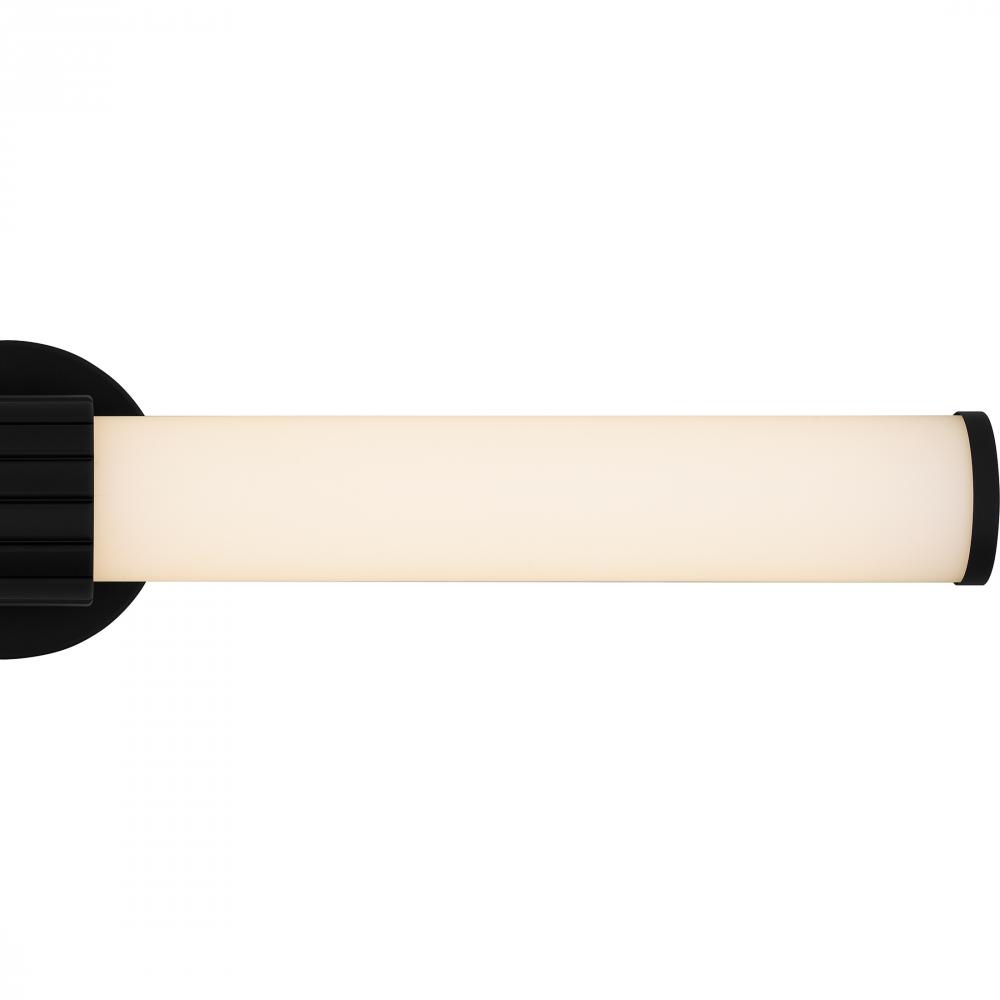 Upgrade your bathroom with the modern style of Kaye. An integrated LED light source shines brightly through the linear etched glass shade, complemented by sleek metal bands. Choose from a variety of sizes, available in your choice of matte black or aged br
