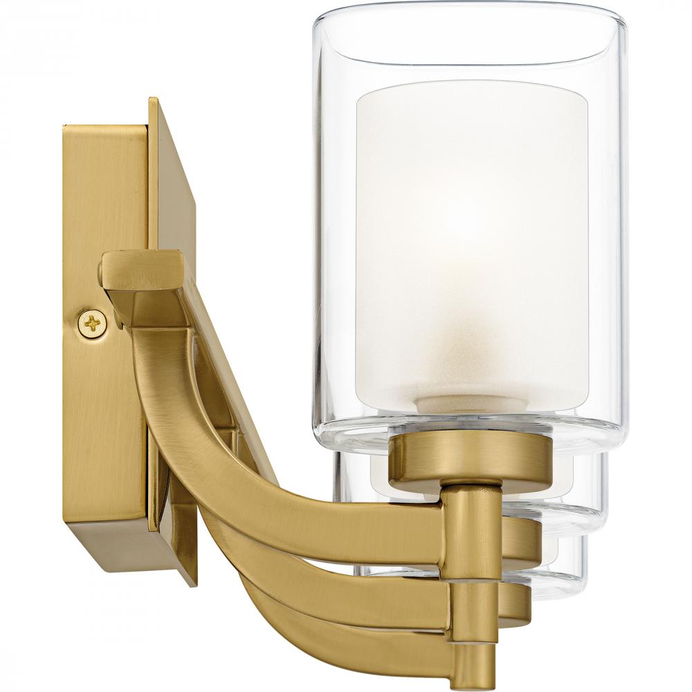 This modern posh wall sconce and vanity light collection features a simplistic design with several classic finish options: choose from brushed nickel, polished chrome, or brushed gold. The inner heavy glass is sand blasted inside and encased within outer c