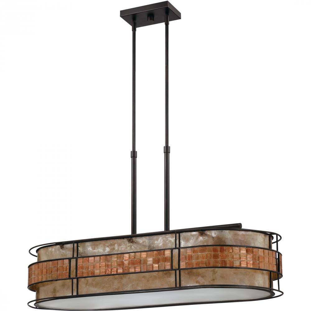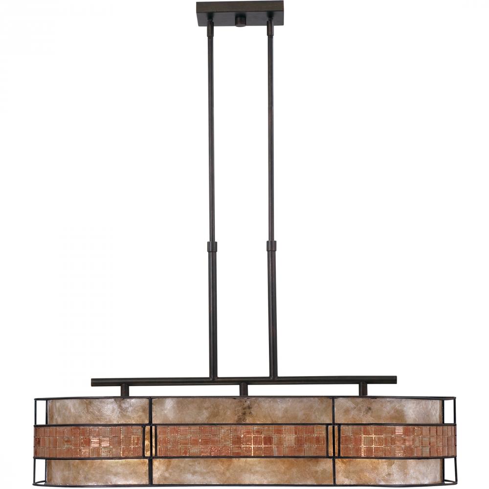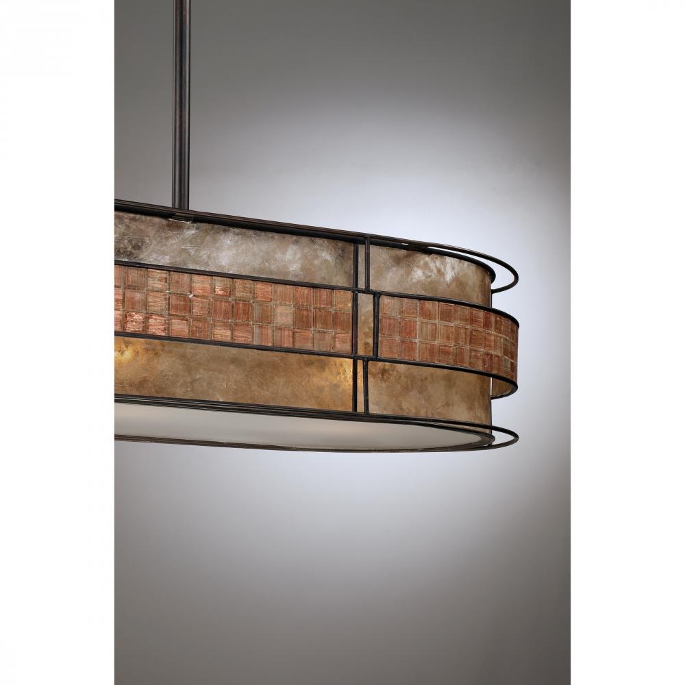 This mica piece is an addition to the Quoizel Naturals collection and features a mosaic tile stripe which appears to be floating around a taupe mica shade. The tiles have a coppery shimmer for an added touch of elegance. It provides a warm and inviting