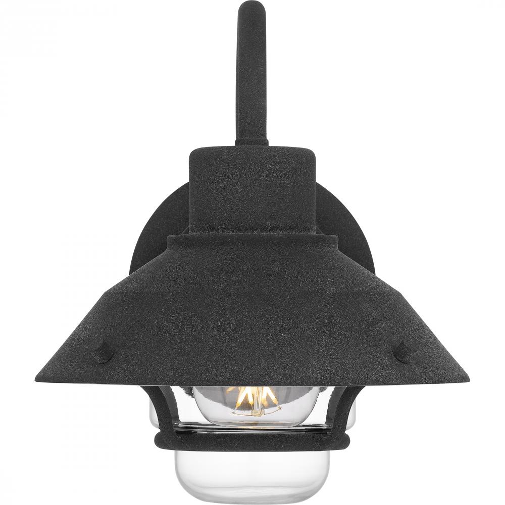 The Lavalier outdoor wall lantern draws style inspiration from classic coastal design. The nautical-inspired silhouette features slender curving lines and a sleek metal shade, both finished in mottled black. A clear glass shade completes the look, allowing