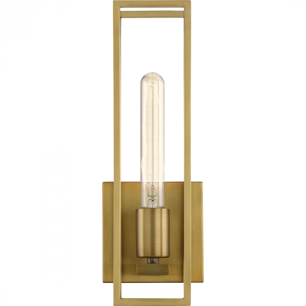 An oblong glass bulb is the perfect companion to the Leighton style, a smart and structural sconce in weathered brass. The square backplate sets the tone for plentiful angular shapes. Place beside a bed or sofa to illuminate a space and add sculptural flai
