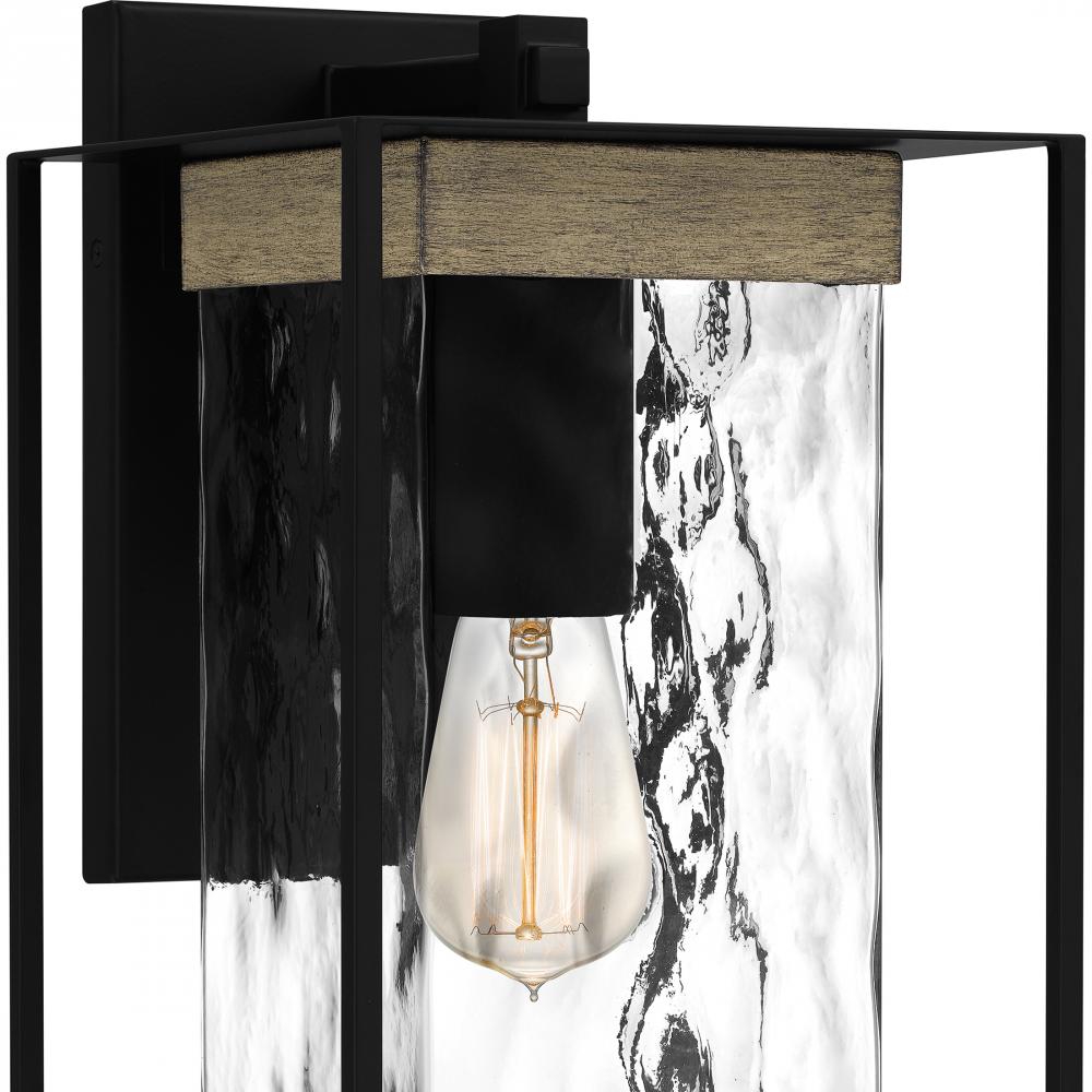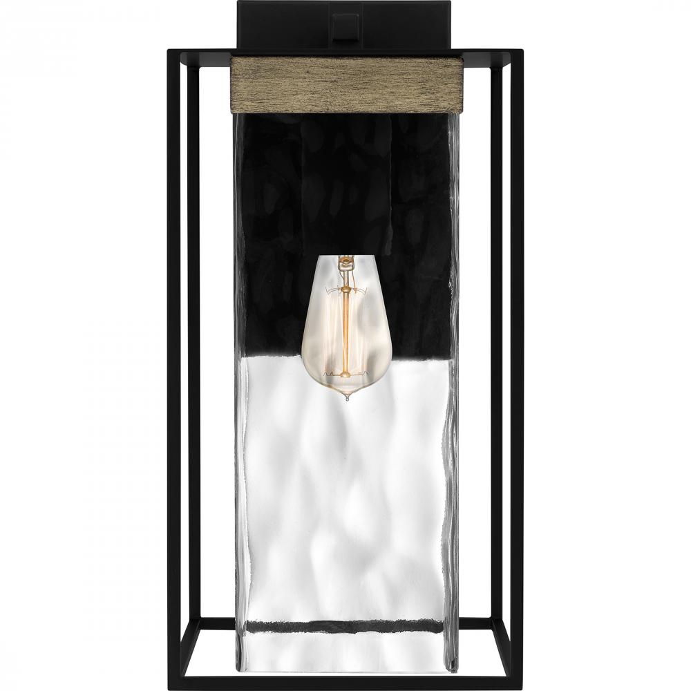 Clear hammered glass adds major visual intrigue in the Longwood lantern collection. This outdoor sconce shines brilliantly with its sturdy rectangular frame, uniquely textured glass shade, and wood accents. A matte black finish completes the look and creat