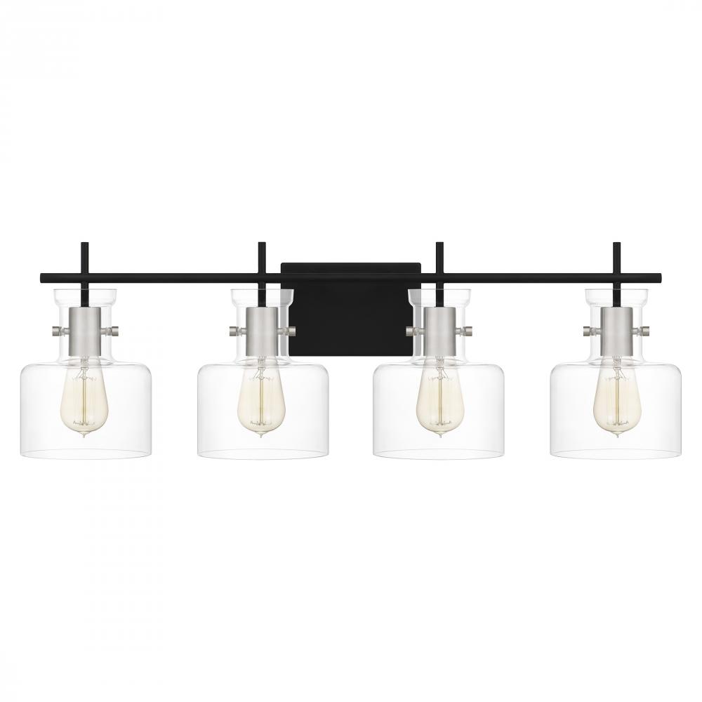A matte black finish includes a hint of shine, courtesy of brushed aluminum accents, in the Pensbury bath light. With clear glass shades to maximize radiance, the light comes in either three or four bulbs. The black-and-silver colorway adds a refined touch