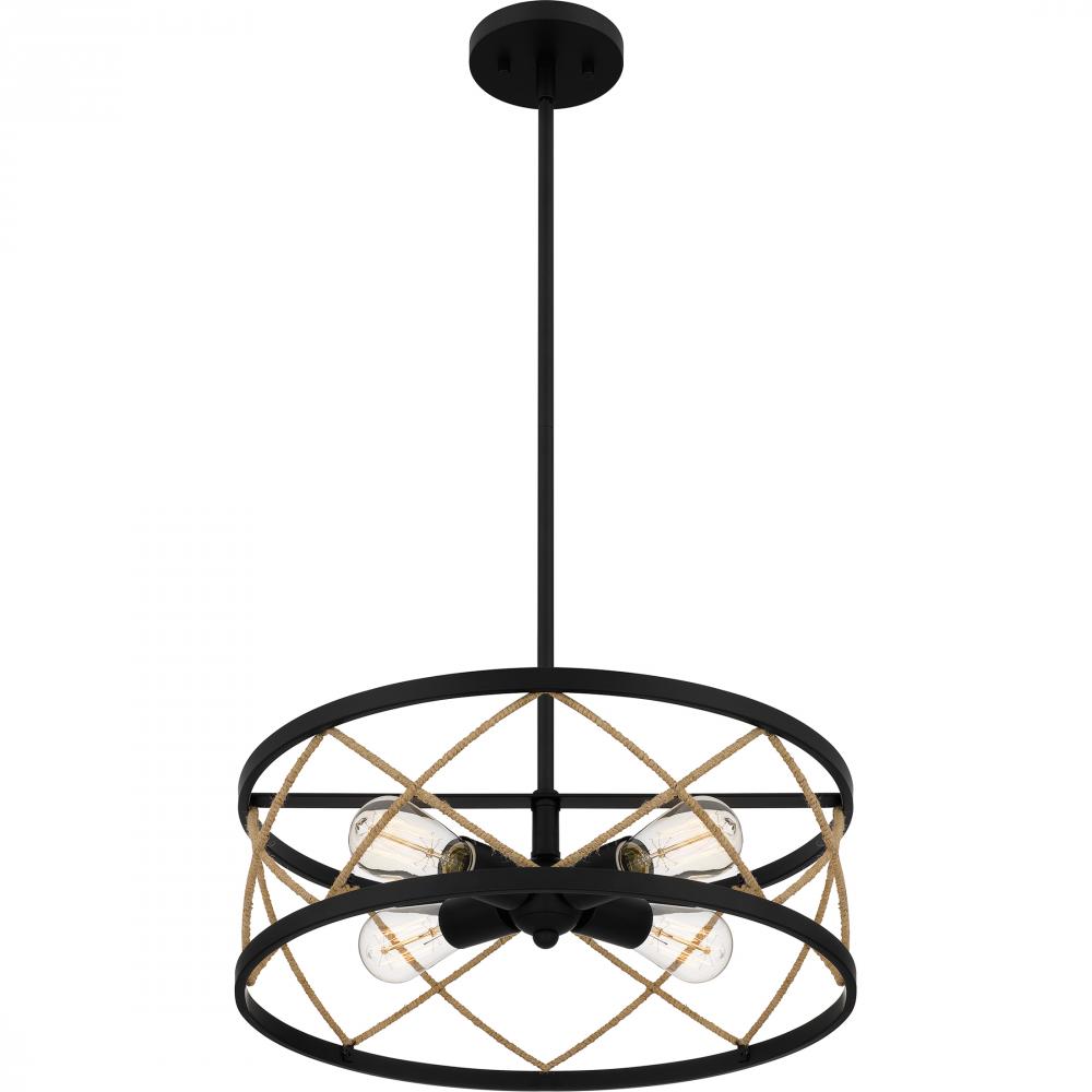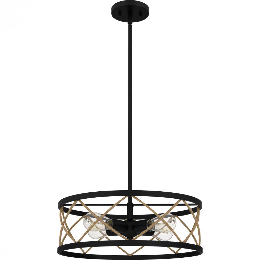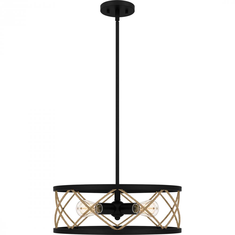 Pattern play. The Cedar Park pendant or semi-flush mount features a harlequin diamond pattern woven in natural rope. A matte black finish provides just enough contrast in this rustic-meets-industrial design.