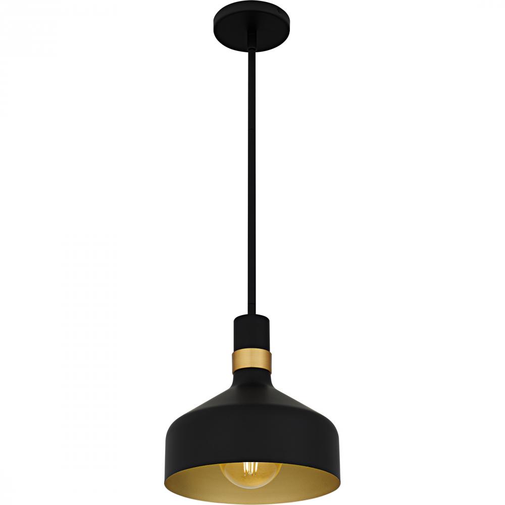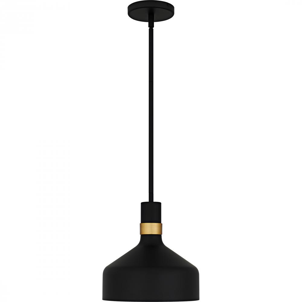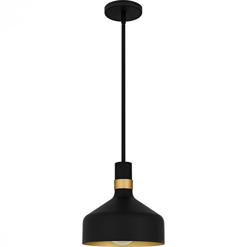 Elevate your space with the Arbor mini pendant, where modern design seamlessly blends with industrial flair. This chic fixture showcases a sleek metal shade available in either matte black or matte white, each adorned with a subtle gold band for a hint of