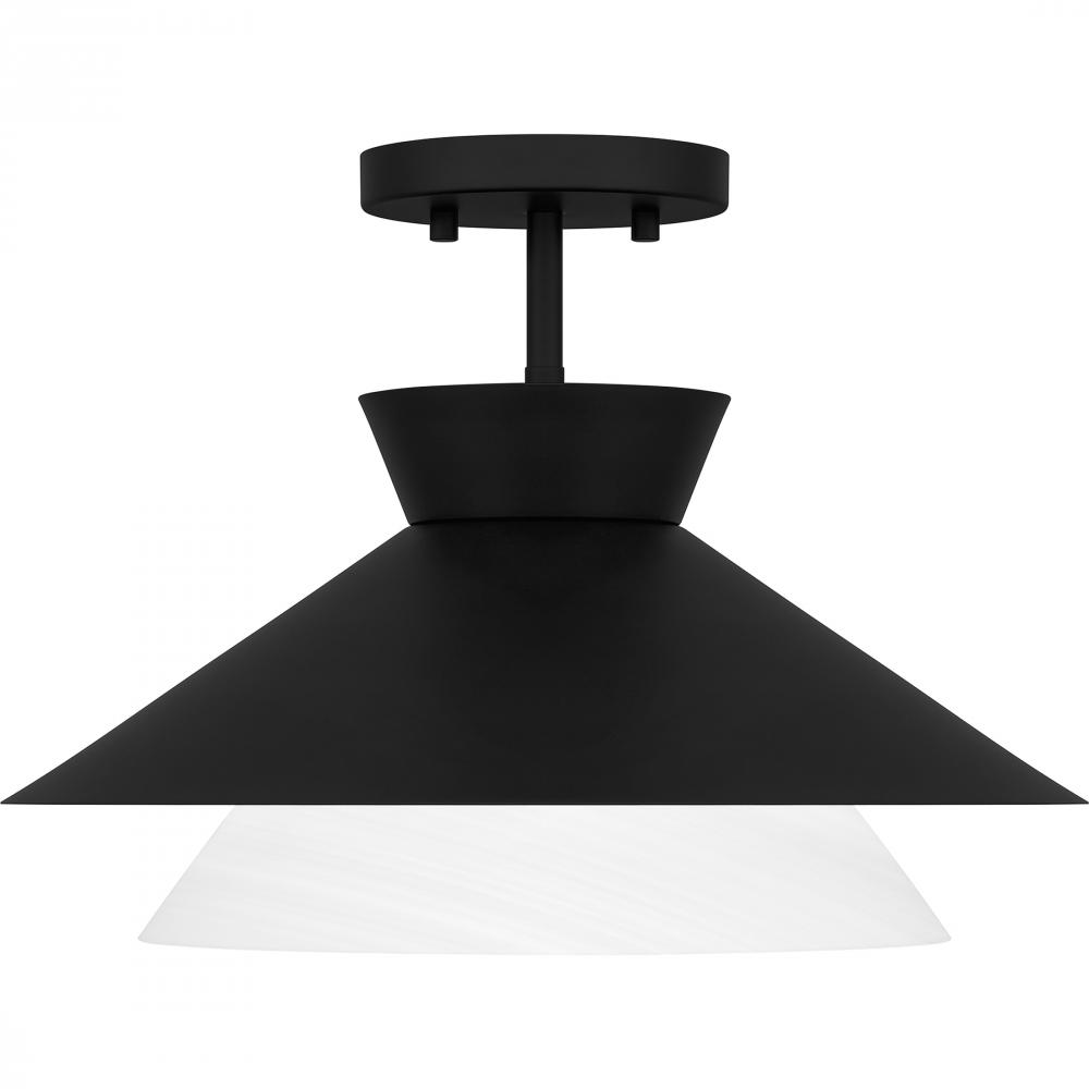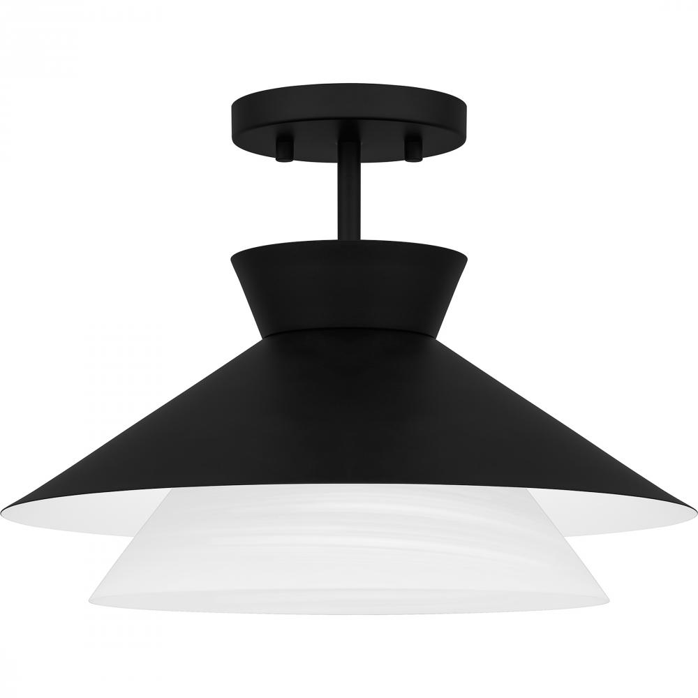 Lionel makes a bold design statement, available as a semi-flush mount or large pendant light. The metal outer shade is finished in a matte black, contrasted beautifully by the inner white alabaster glass shade. With its geometric silhouette and sleek desig
