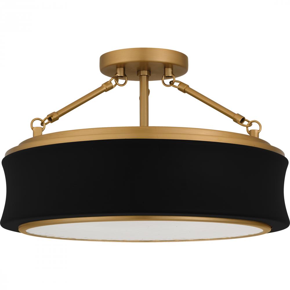 The Dylan semi-flush mount light exudes modern elegance with its sleek design and sophisticated finishes. Featuring a matte black frame with striking gold accents, this fixture adds a touch of luxury to any room. The bottom of the light is adorned with a b