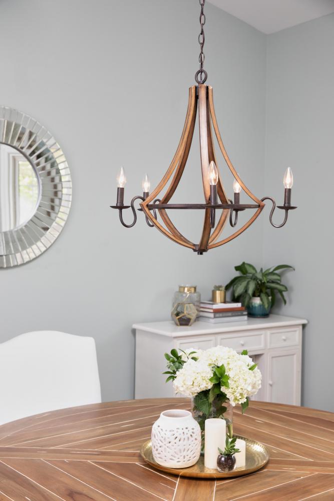Traditional warmth meets industrial minimalism in the Shire collection. The rubbed black edges on the faux wood frame complements the rustic black finish of the inner rings. Curved arms and candelabra bulbs add classic charm to the chic simplicity of the d