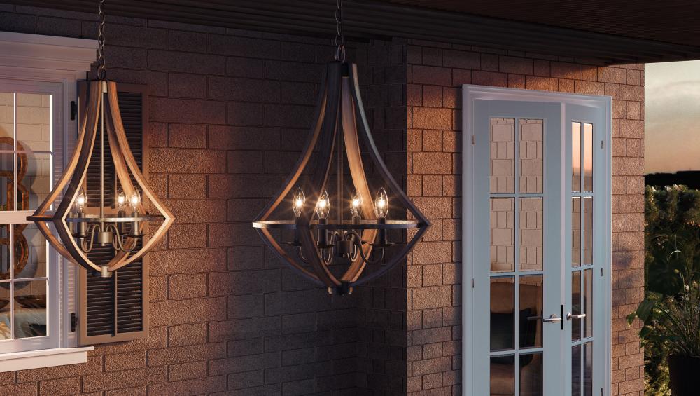 Traditional warmth meets industrial minimalism in the Shire collection. The rubbed black edges on the faux wood frame complements the rustic black finish of the inner rings. Curved arms and candelabra bulbs add classic charm to the chic simplicity of the d