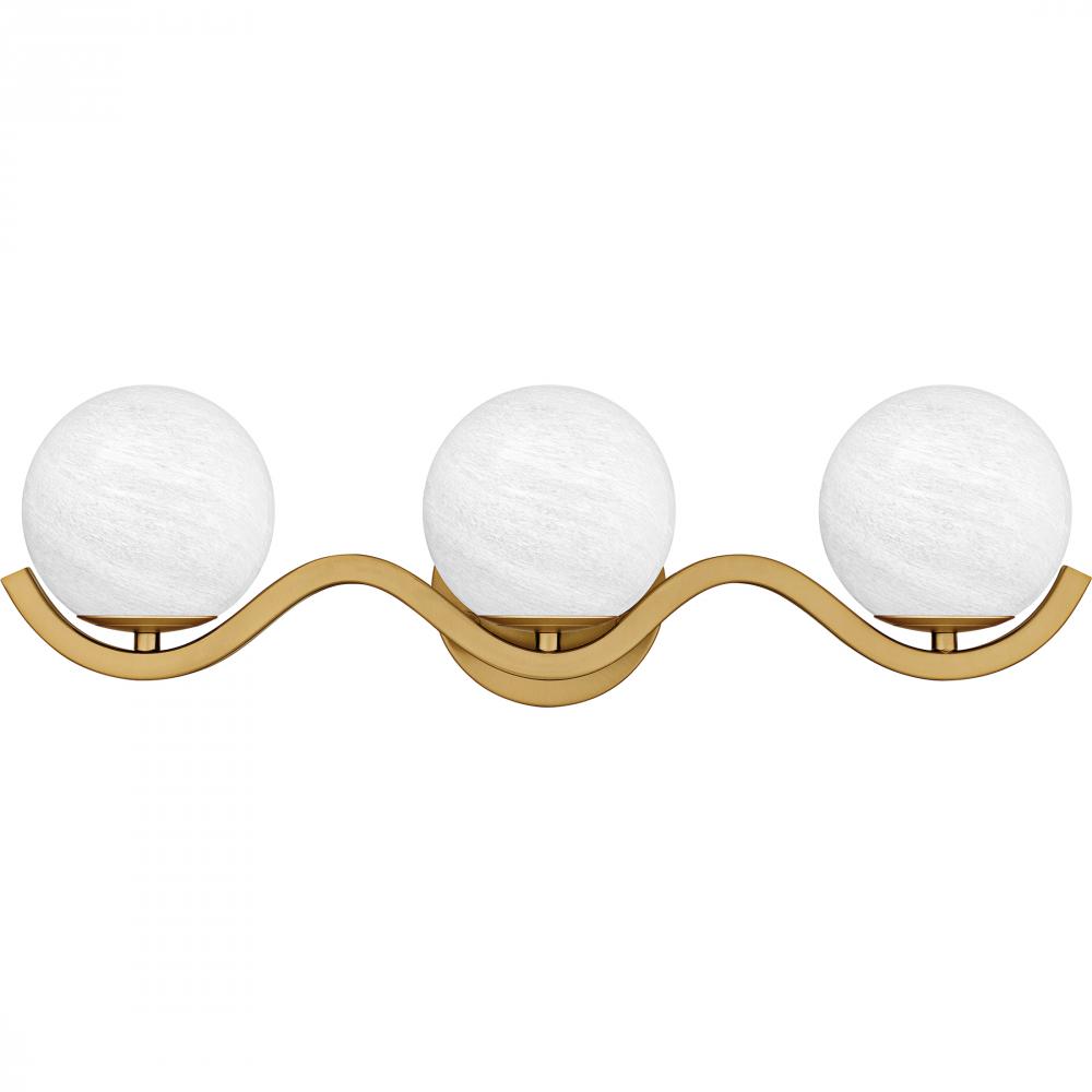 True to its name, the Spherical vanity light embodies modern art with its graceful curved lines and distinctive glass orbs. Finished in lustrous aged brass, this sculptural fixture features striking white cloud glass spheres that make a bold style statemen