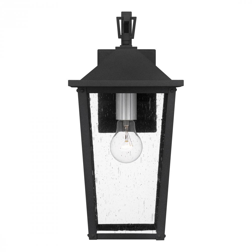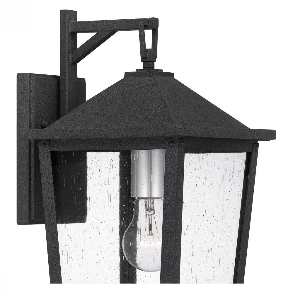 Clear seeded glass gives Stoneleigh a touch of whimsy. In a mottled black finish, this pendant design is otherwise stately and handsome. Suspend it within a portico to welcome guests in refined fashion.