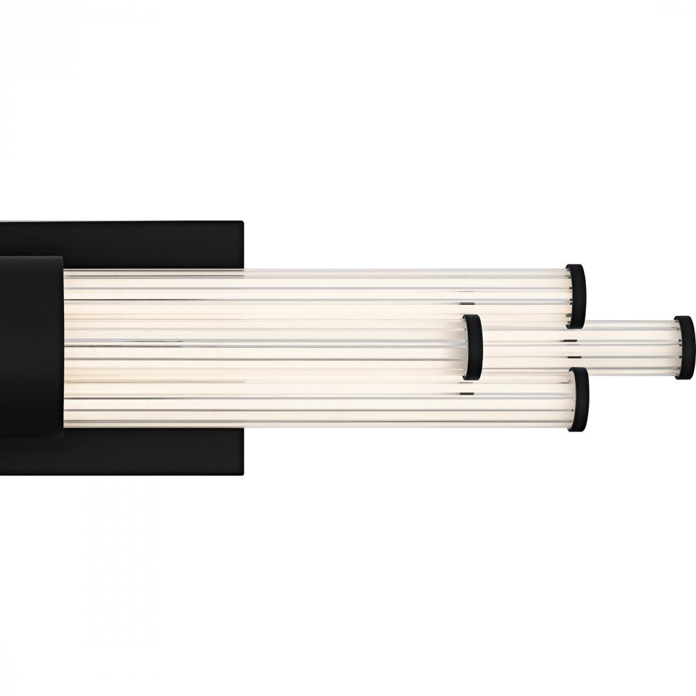 The Talbott bath light features a striking modern design with a sleek, minimalist aesthetic. The rectangular backplate contrasts with the series of parallel cylindrical acrylic rods, creating a unique and eye-catching visual. Each rod houses an integrated