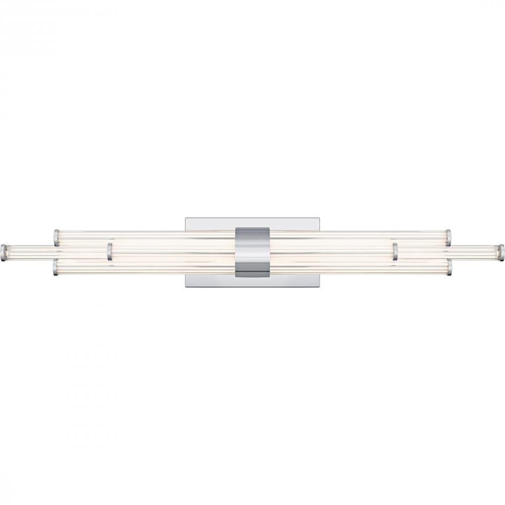 The Talbott bath light features a striking modern design with a sleek, minimalist aesthetic. The rectangular backplate contrasts with the series of parallel cylindrical acrylic rods, creating a unique and eye-catching visual. Each rod houses an integrated
