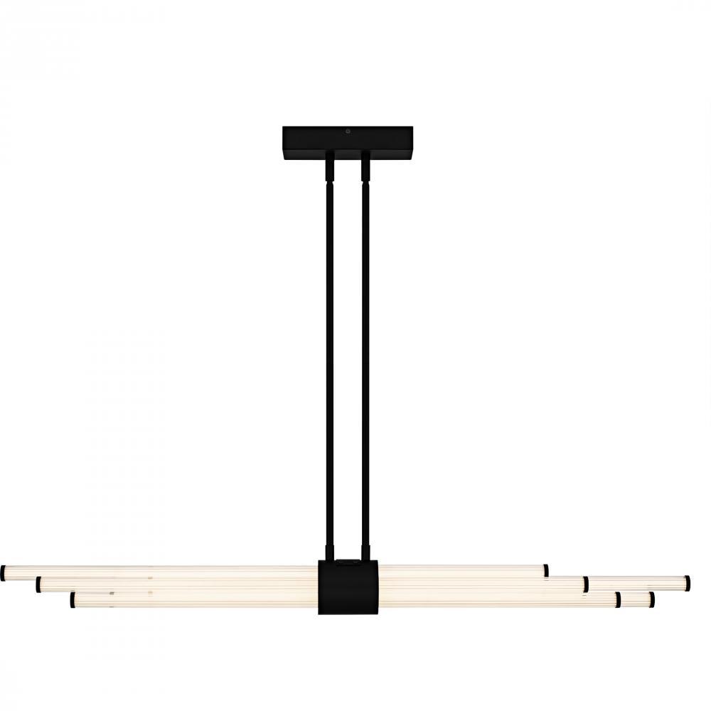 The Talbott island chandelier features a striking modern design with a sleek, minimalist aesthetic. The rectangular canopy contrasts with the series of parallel cylindrical acrylic rods, creating a unique and eye-catching visual. Each rod houses an integra