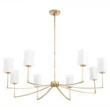 The Ayala series of chandeliers, wall mounts and sconces boasts clean lines and soft curves contrasted by right angles. The chandelier's slender stem extends down to a central cylindrical hub. From this hub, six arms extend outwards and slightly upwards in a symmetrical arrangement. Each arm supports a rectangular satin opal glass shade with a slightly flared design at the top, housing a candelabra socket. Choose from matte black or gold leaf finishes.