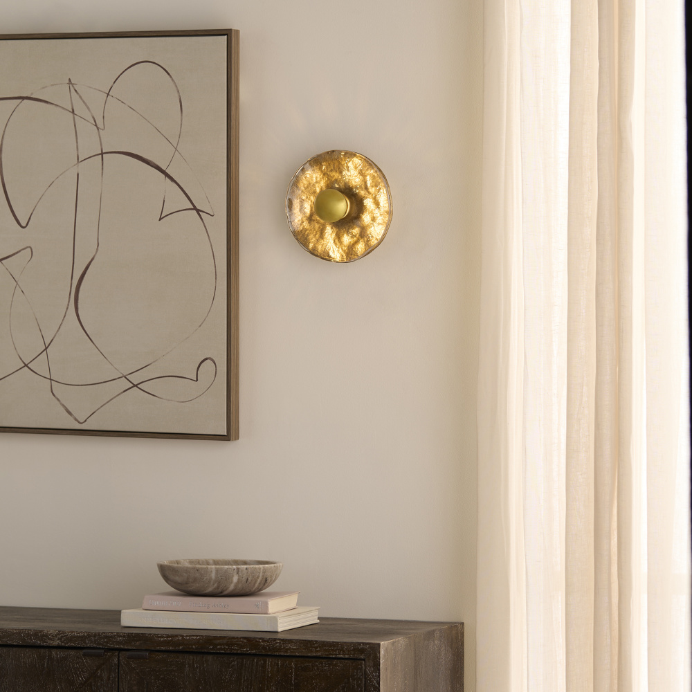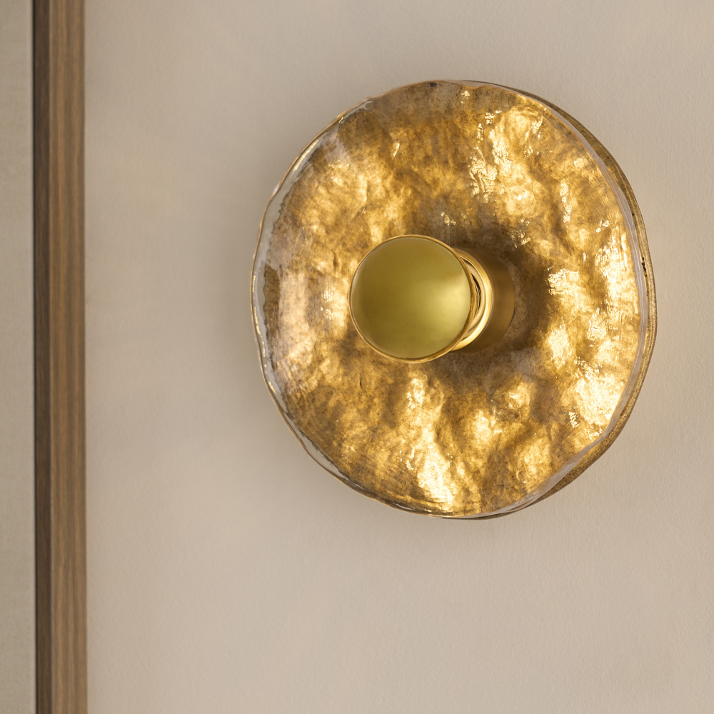 Bring contemporary character to any space with Del Rey. This modern wall sconce features artisan glass layered over a brushed brass finish, creating an ambient light display. It can also emit outward-facing light, offering a more direct illumination.