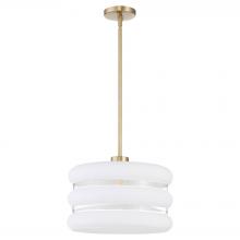 The Gillis pendant blends aesthetics and functionality to add sophistication to any space. Its intricate pillowy design features a clear glass cylinder with three evenly-spaced, horizontal frosted glass rings. A medium base lamp emits a warm, inviting glow, creating a cozy atmosphere. Available in aged brass or matte black finishes.