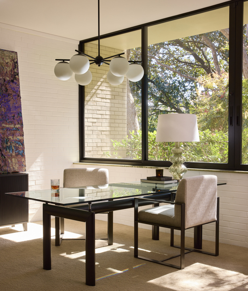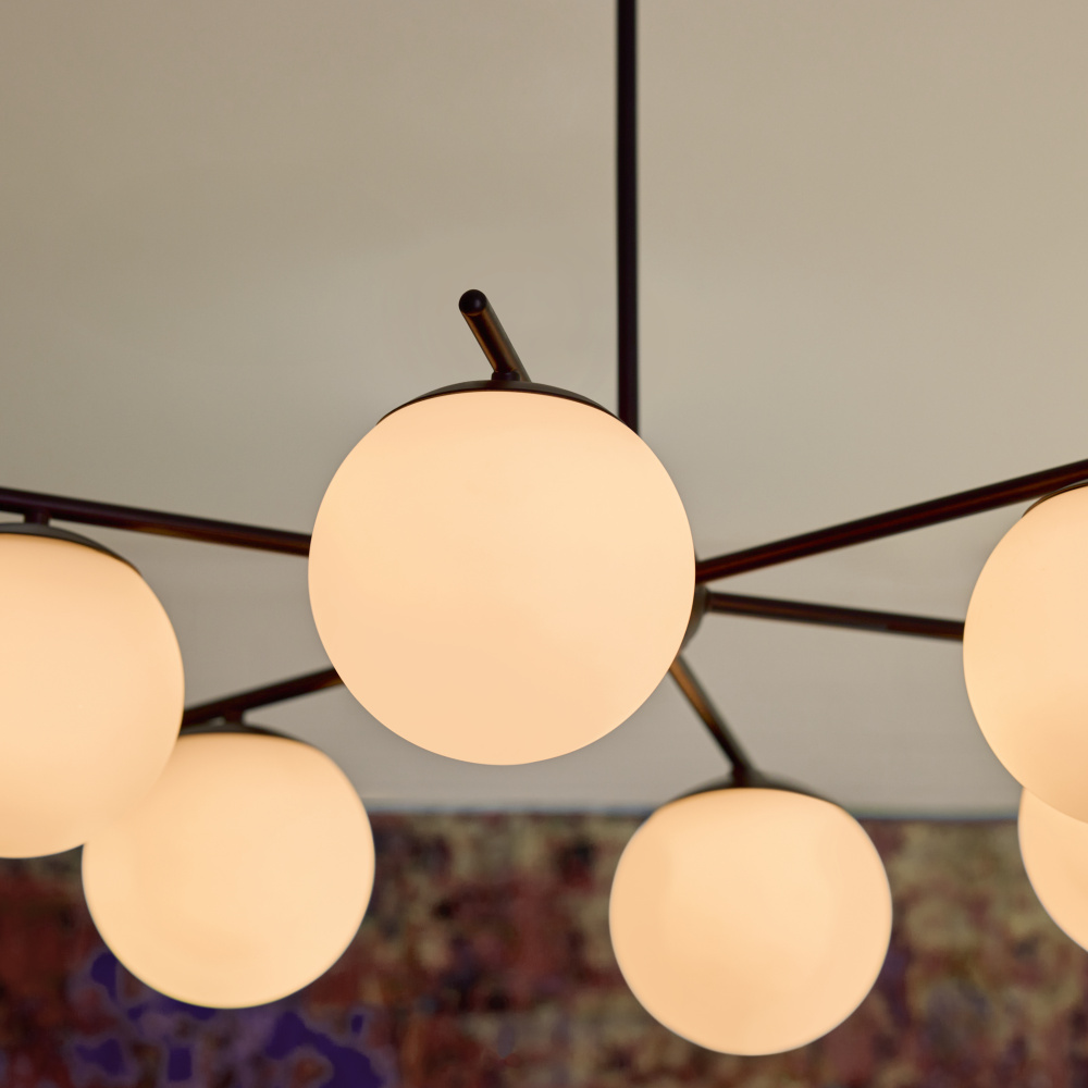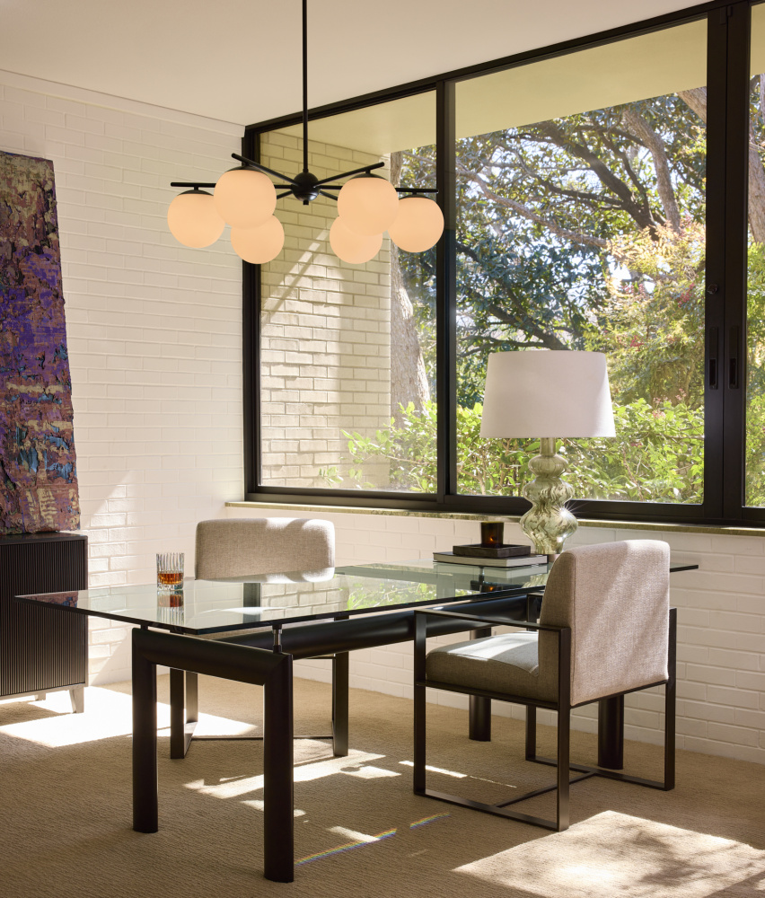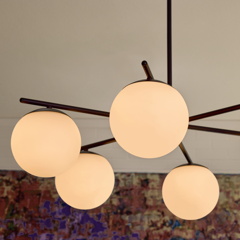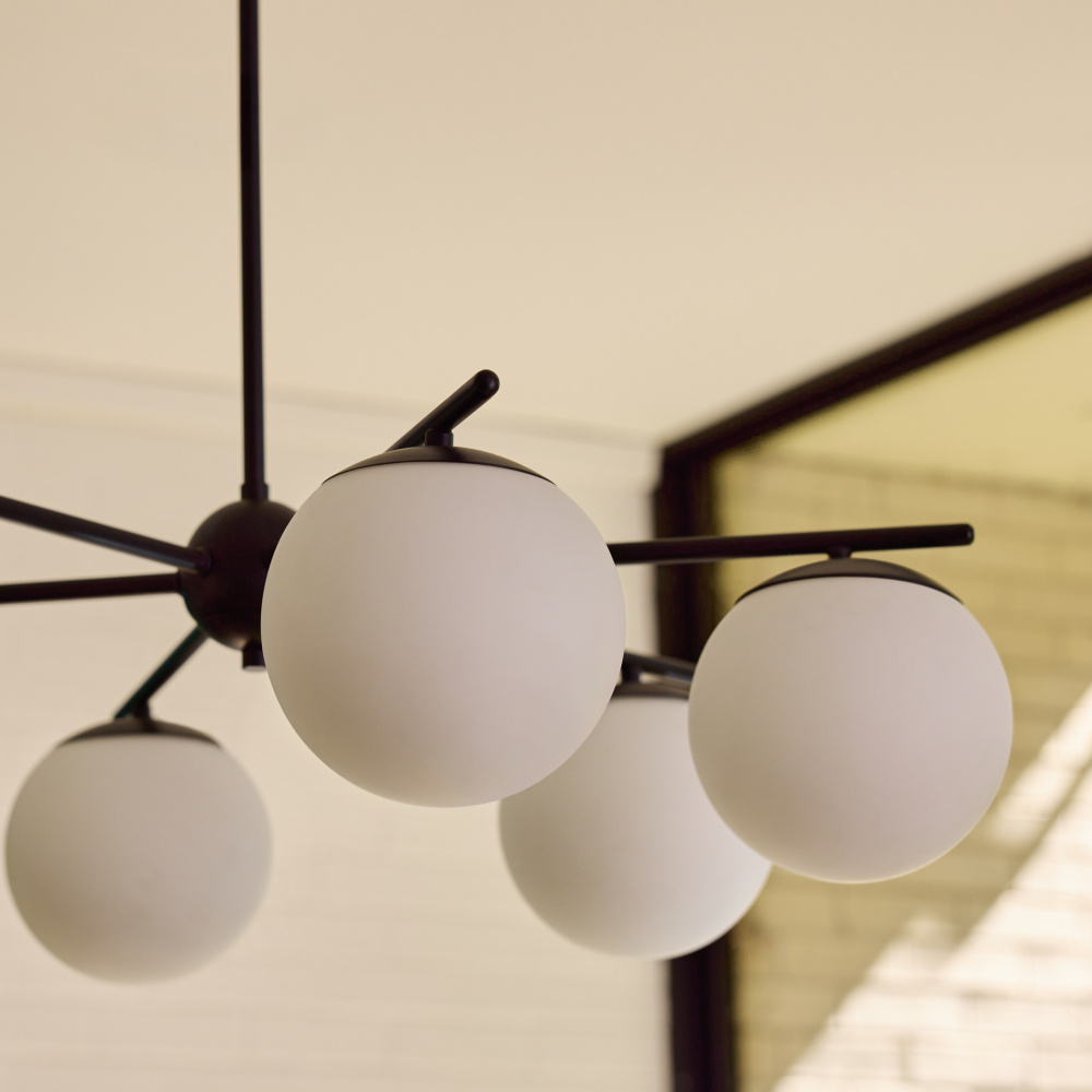 Part of the Main Street collection, the Jasper collection showcases a modern hub-and-spoke design with round globe shades and clean symmetry. Available in matte black or satin nickel and offered in both 3-light and 6-light configurations, it’s designed to suit a range of modern interiors.