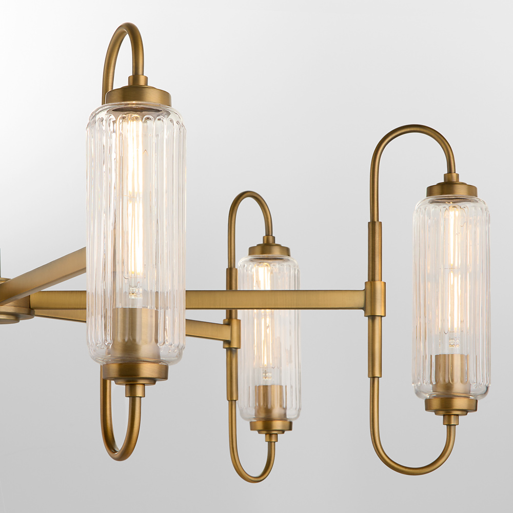 Inspired by the electronics of radio's early days, the Whitmire collection blends modern style with a sense of nostalgia for the emerging age of communication. With clear ribbed glass and a brushed brass finish, it perfectly blends timeless charm and forward-thinking design. Ideal for spaces that embrace tradition and innovation, the Whitmire collection brings a unique sophistication to living rooms, dining rooms, or entryways that call for an eye-catching centerpiece.