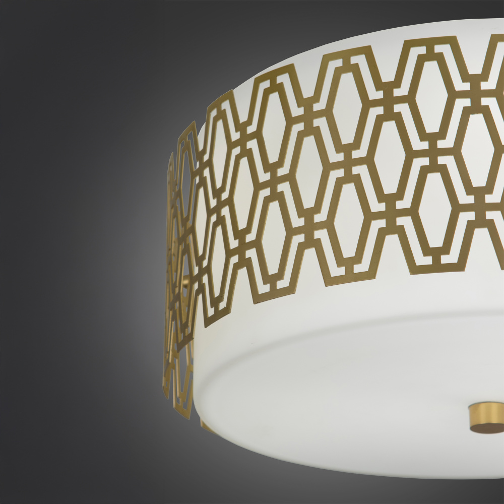 The Marcel Flush Mount features a mid-century modern geometric frame in a Modern Brass finish is illuminated by a warm glow of the frosted-cased white glass shade. It's the perfect touch of timeless design to bring warm ambient light to any room.