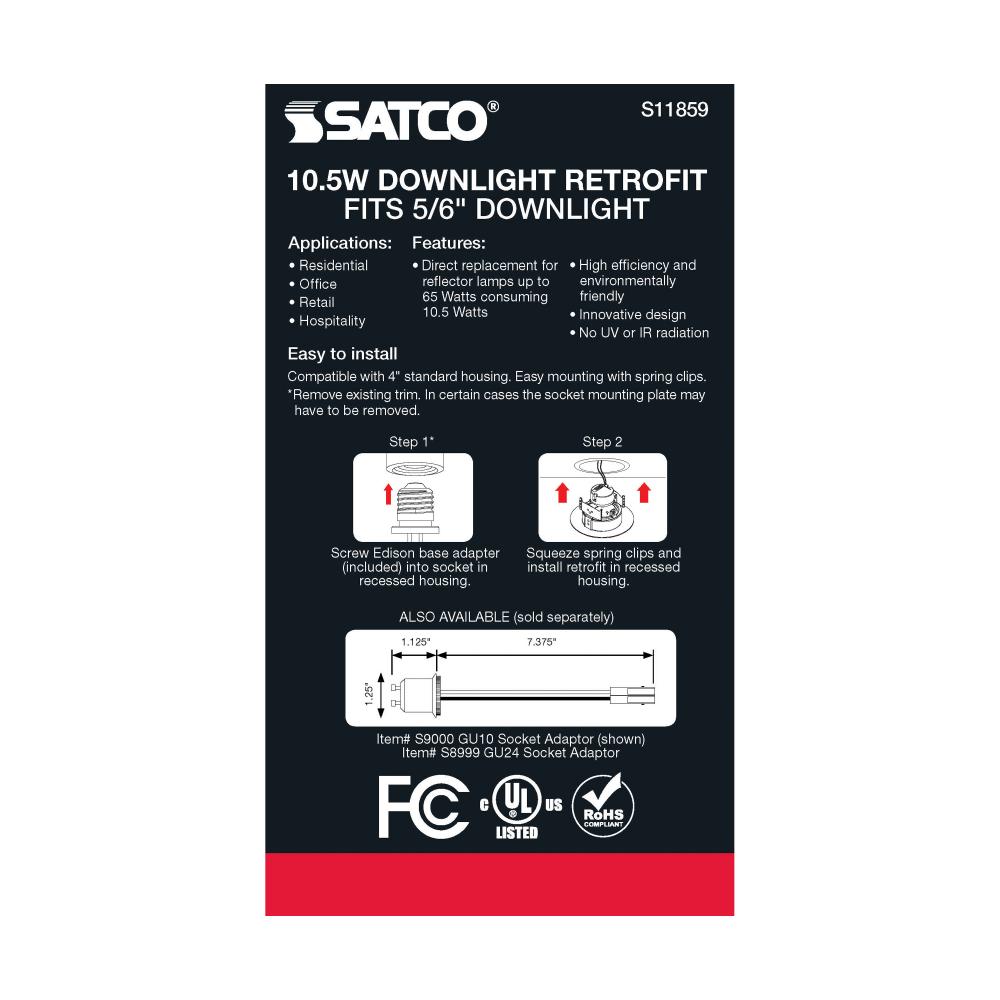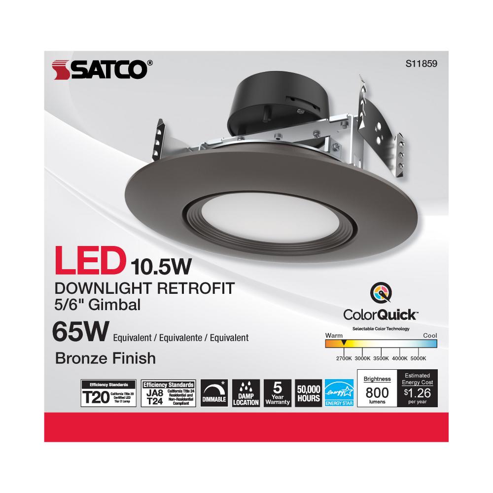 Satco's S11859 10.5 watt gimbaled LED downlight is a sleek lighting solution for residential and commercial applications. Illuminate kitchens, dining rooms, and office spaces with this CCT selectable fixture. Versatile and functional, this brushed nick