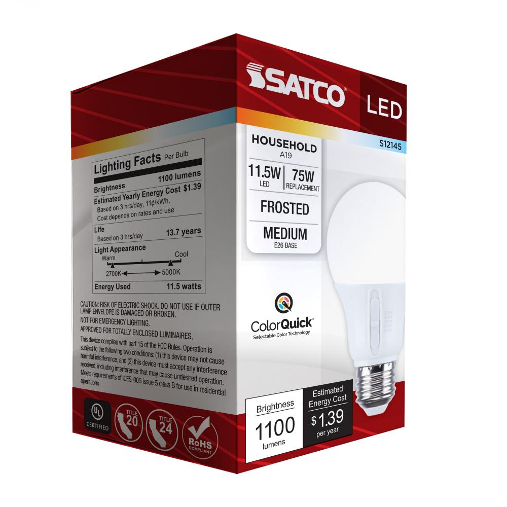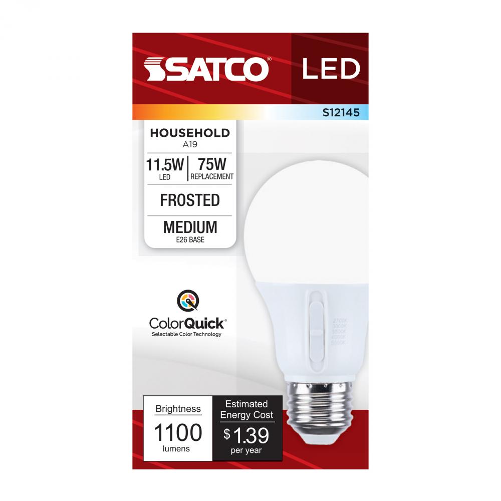 Enhance your lighting with SATCO NUVO's high-performance 11.5-watt LED A19 bulb (S12145), engineered for superior light quality and efficiency. With an E26 base, 5 CCT selectable technology (2700K–5000K), and a 90 CRI, this frosted bulb delivers vivi