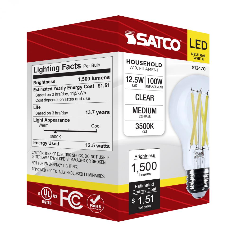 Satco's S12470 12.5-watt, A19 LED bulb with a medium base is dimmable and offers warm white light with a 300 degree beam spread. Elegant and long-lasting, this clear bulb delivers 15,000 hours of exceptional illumination.
