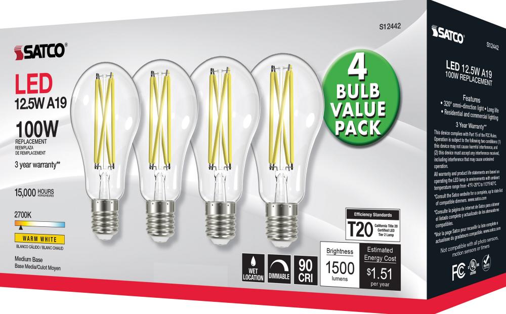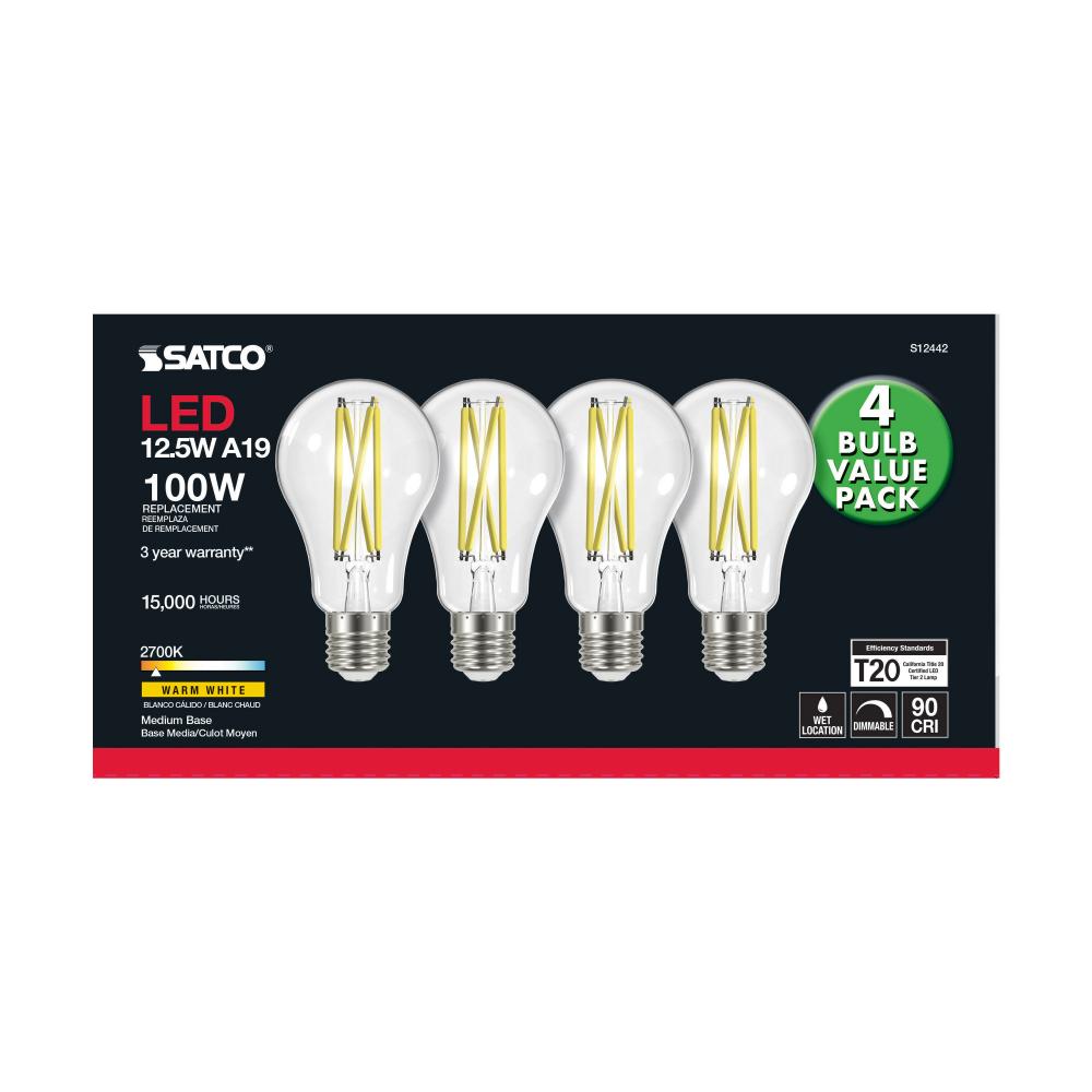 12.5 Watt A19 LED Filament; 100 Watt Replacement; Clear; Medium base; 2700K; 120 Volt; 4-Pack