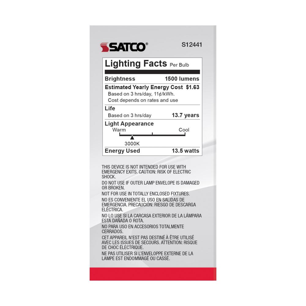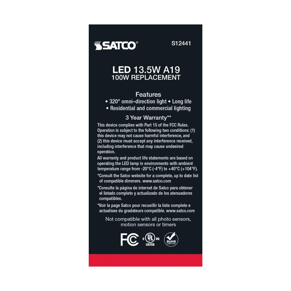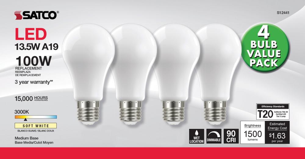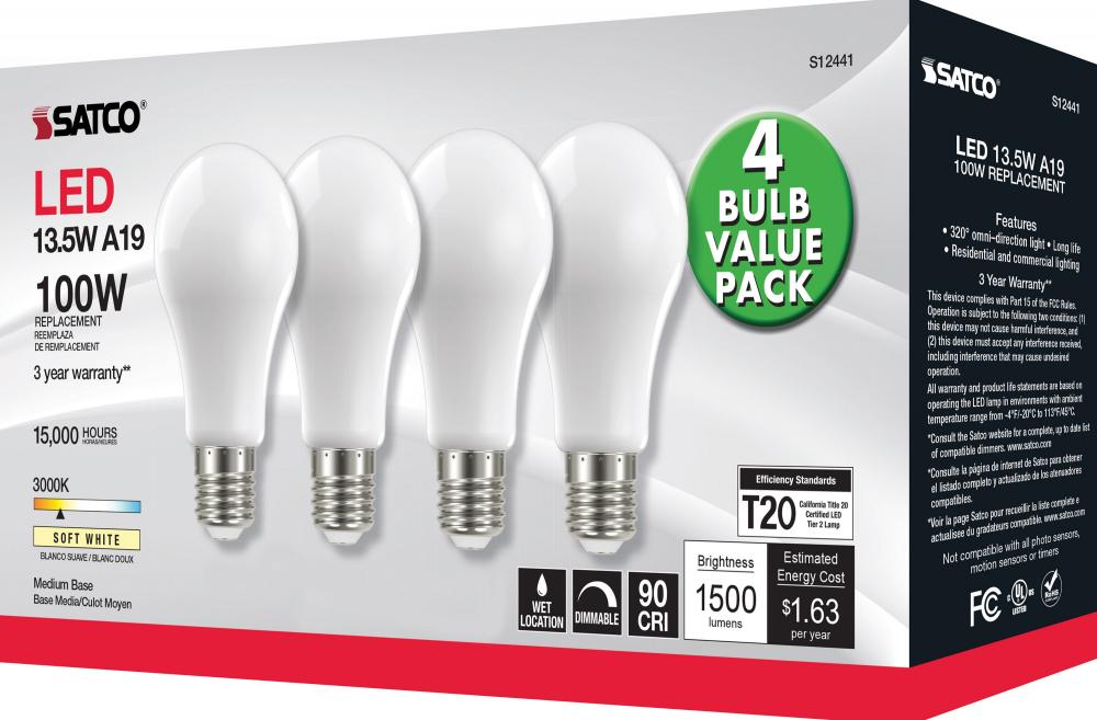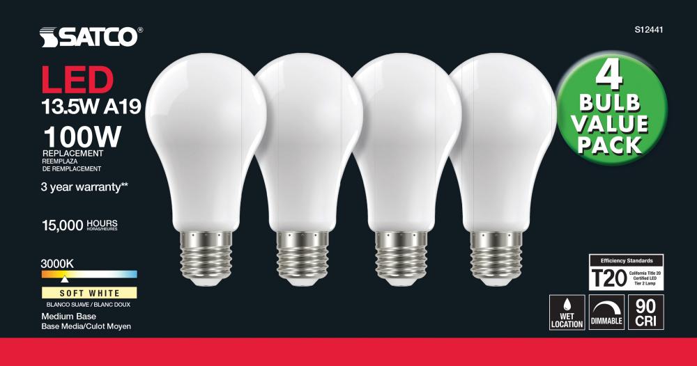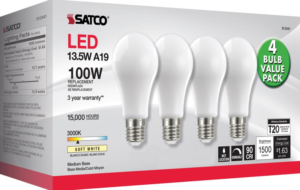 Satco's S12441 13.5-watt LED lamp is traditional, yet contemporary with its sleek finish and energy saving LED technology. Elegantly illuminate any room in the house with this 4 pack of dimmable bulbs. Sophisticated and modern, this lamp delivers 15,00