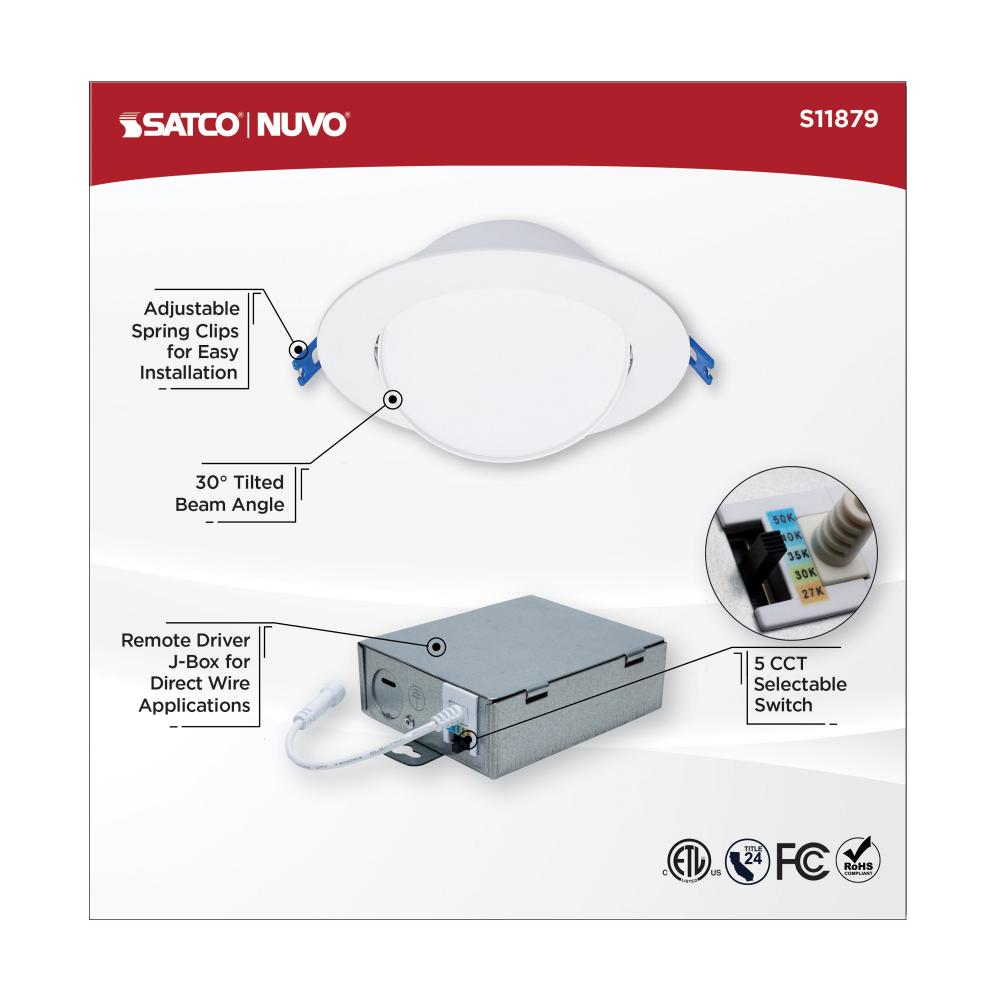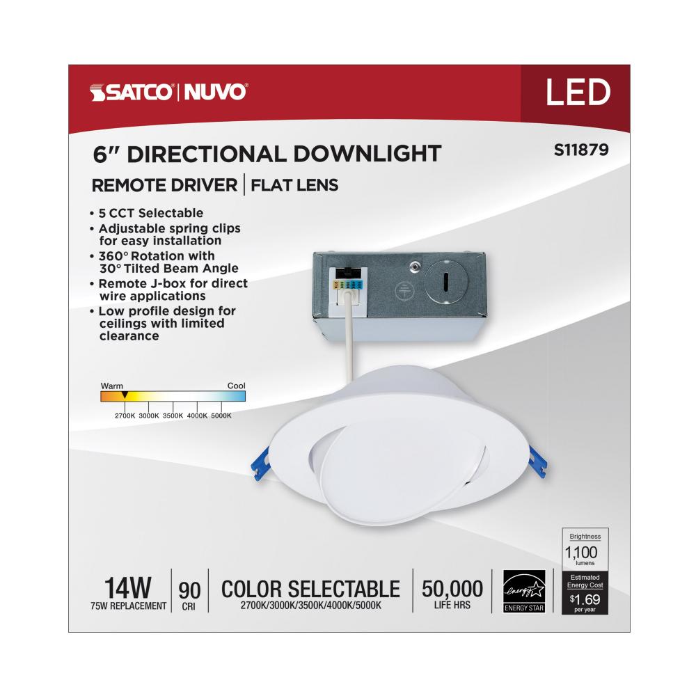 SATCO NUVO's S11879 LED Low Profile Directional Downlight illuminates your space with precision and style. This downlight is an 14-Watt, 6-inch round model with a 5 CCT color temperature selectable option. It features a 360 degree rotation and a 30 deg