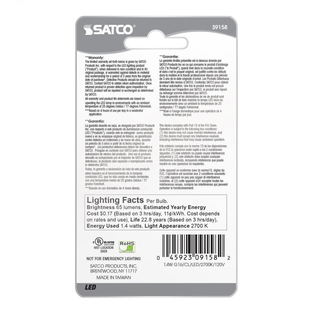 1.4 Watt LED; G16 1/2; Clear; 2700K; Medium base; 120 Volt; Carded