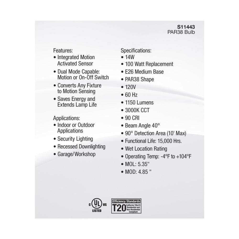 Illuminate your surroundings with SATCO NUVO's advanced S11443 PIR 14-watt, PAR38 LED screw-base lamp featuring an integrated motion sensor. With this lamp, you can easily turn any space into a motion-activated light source without requiring additional