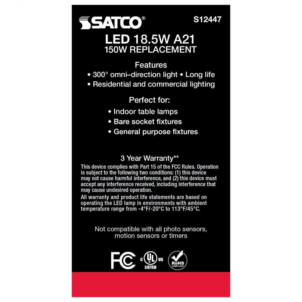 Satco's S12447 18.5-watt LED lamp is traditional, yet contemporary with its sleek finish and energy saving LED technology. Elegantly illuminate any room in the house with this dimmable, frost finished bulb. Sophisticated and modern, this lamp delivers