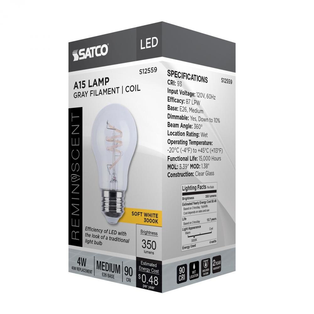 4 Watt A15 LED; Reminiscent; Flex Gray Coil Filament; E26; 3000K; 120 Volt