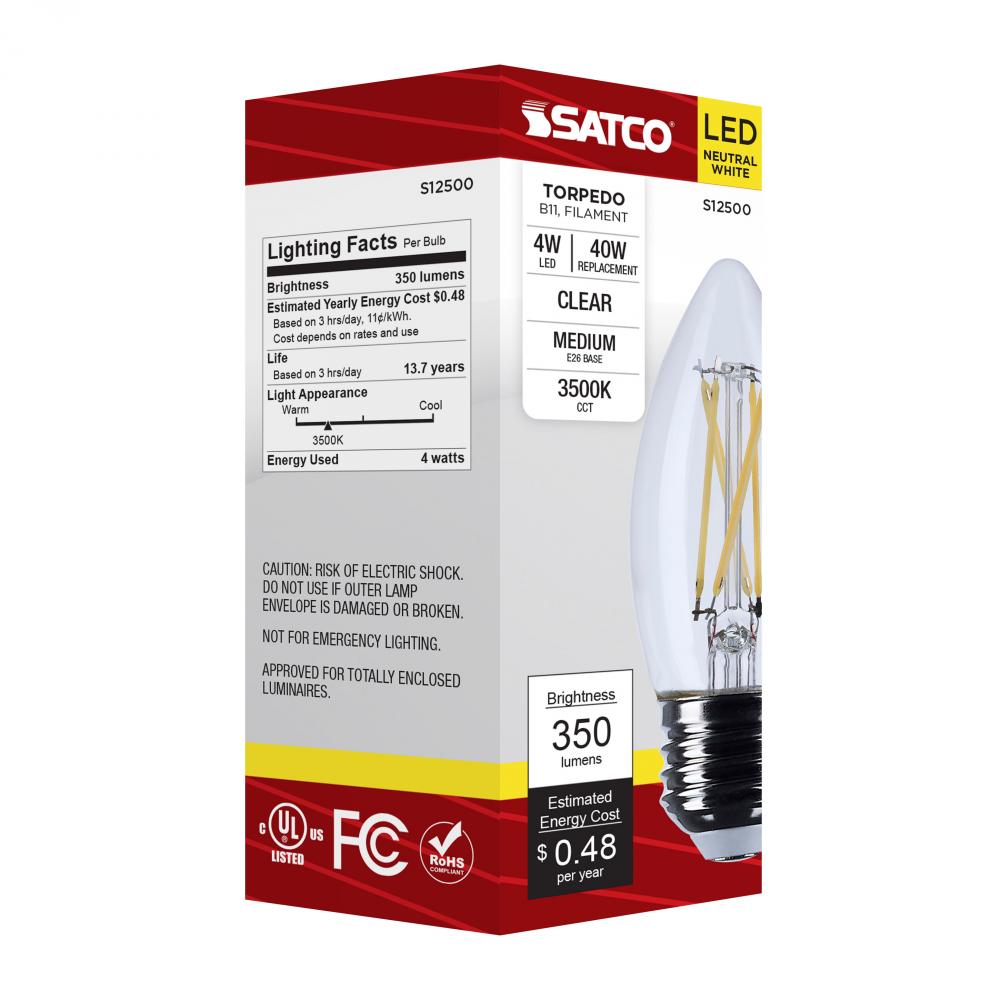 4 Watt B11 LED; Medium Base; Clear; 3500K CCT; 120 Volt