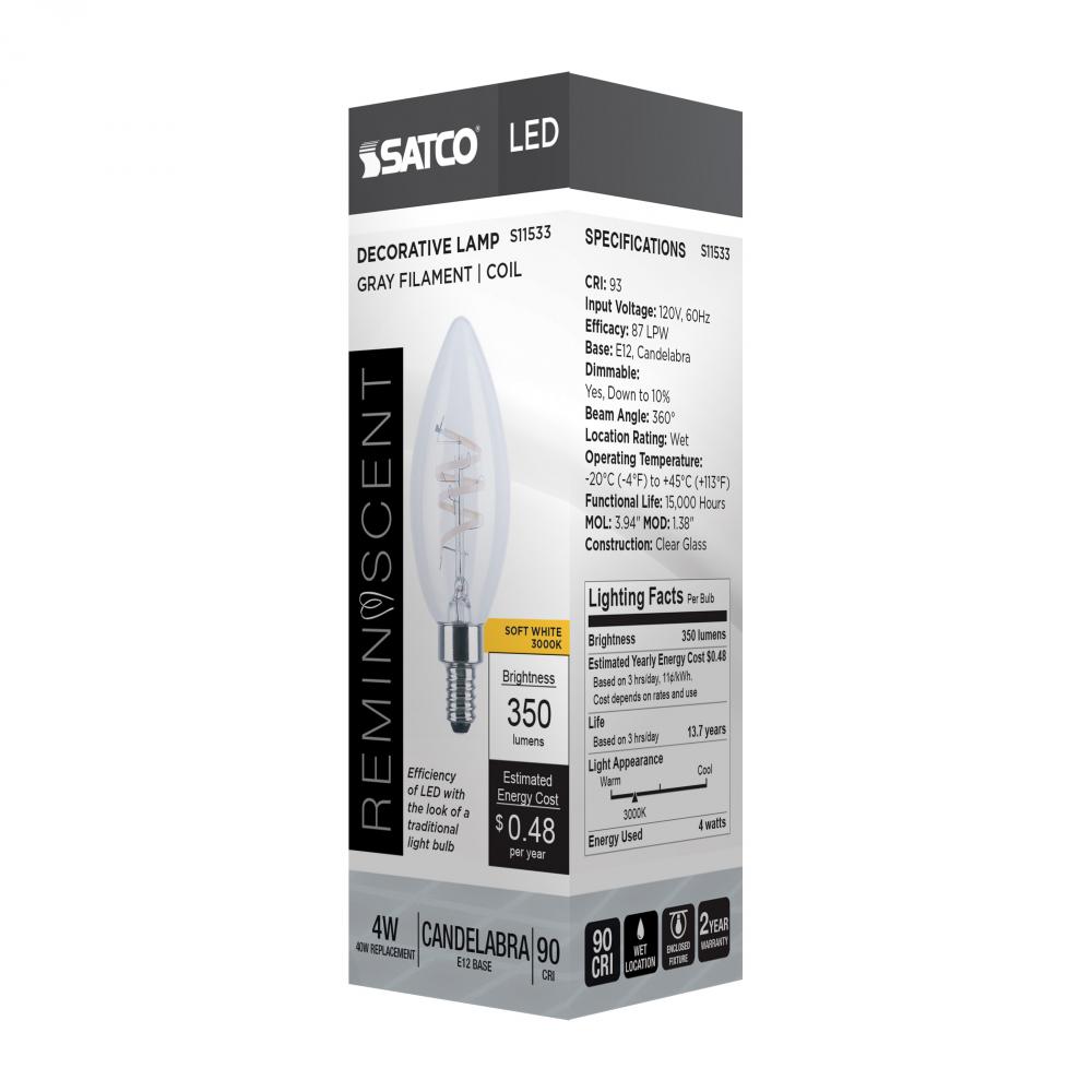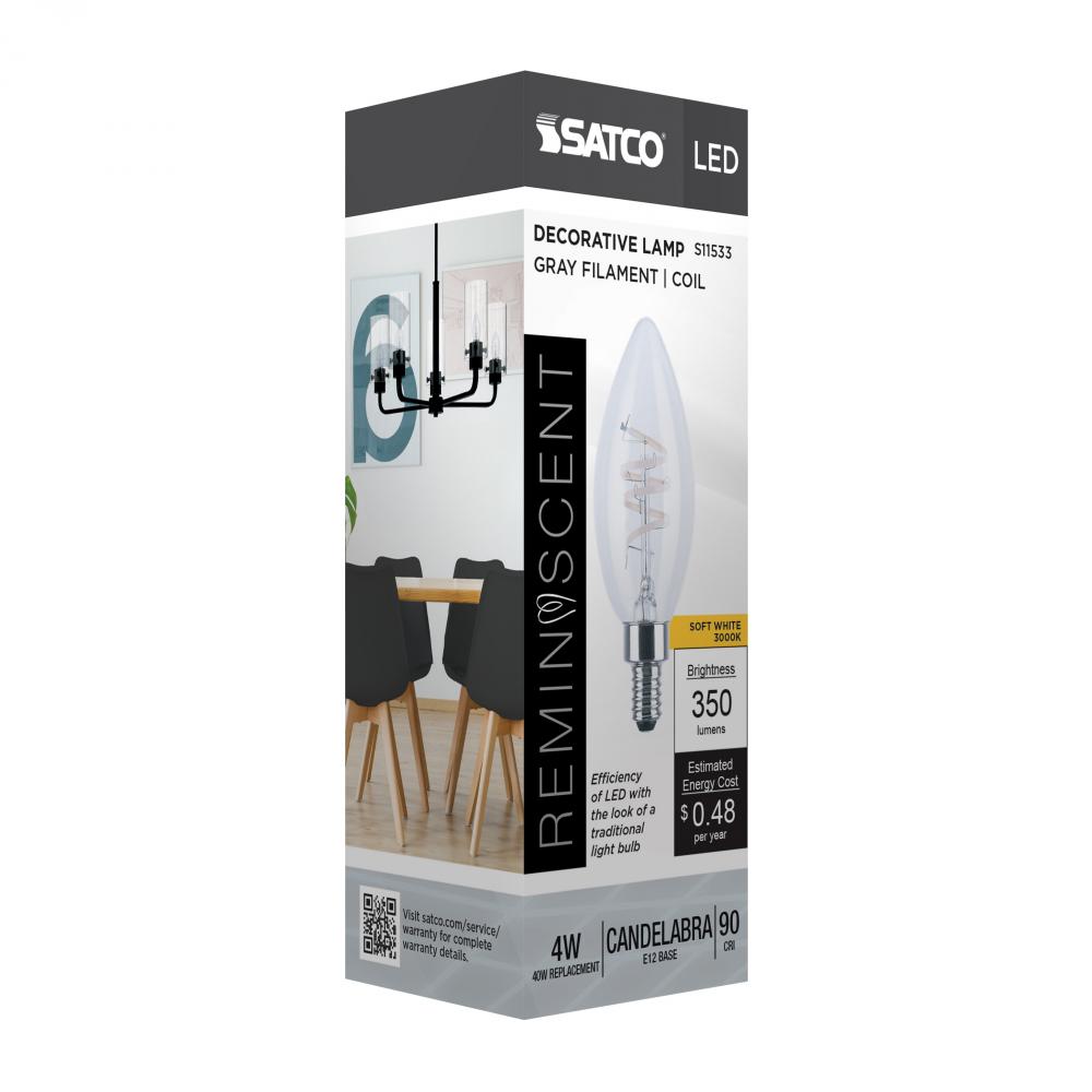 4 Watt B11 LED; Reminiscent; Flex Gray Coil Filament; E12; 3000K; 120 Volt