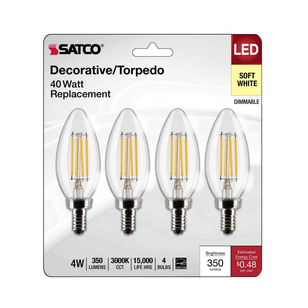 Satco's 4-watt, LED B11 bulb with a candelabra base is dimmable and offers soft white light and a 300 degree beam spread. Wet rated for kitchens and bathrooms, the carded 4-pack is suitable for retail display. Elegant and long-lasting, this clear bulb
