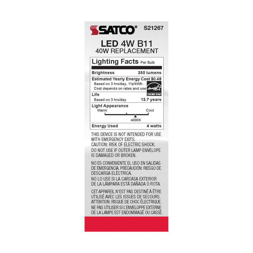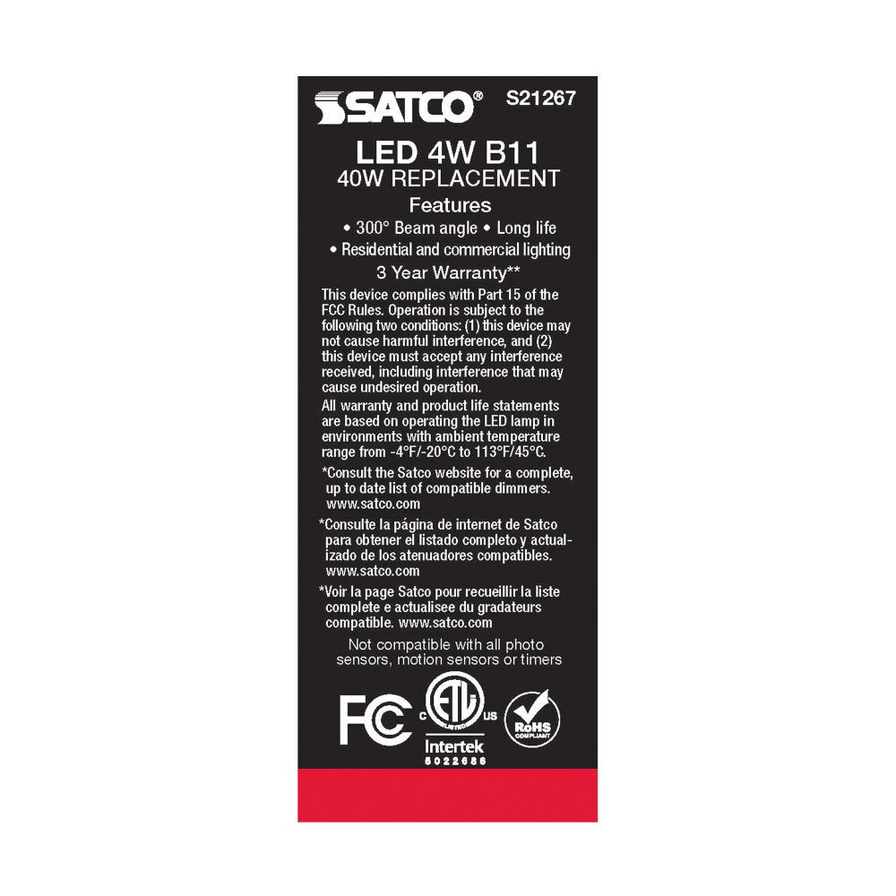 Satco's S21267 4-watt LED lamp is traditional, yet contemporary with its vintage style and energy saving LED technology. Elegantly illuminate any room in the house with this dimmable, clear bulb. Sophisticated and modern, this lamp delivers 15,000 hour
