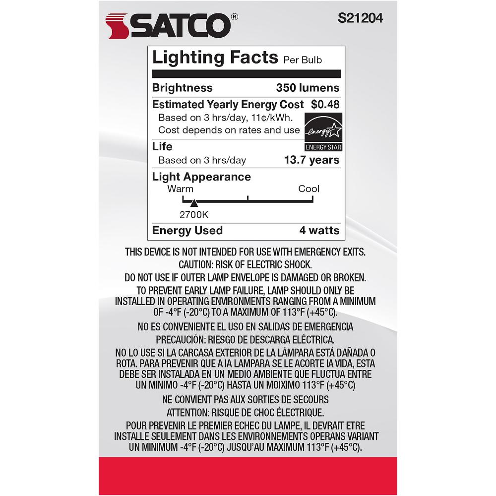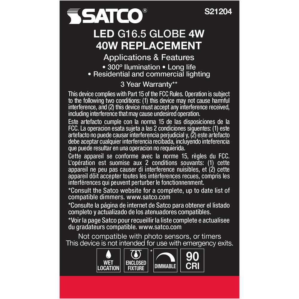 Satco's S21204 4-watt LED lamp is traditional, yet contemporary with its vintage style and energy saving LED technology. Elegantly illuminate any room in the house with this dimmable, globe shaped bulb. Sophisticated and modern, this lamp delivers 15,0