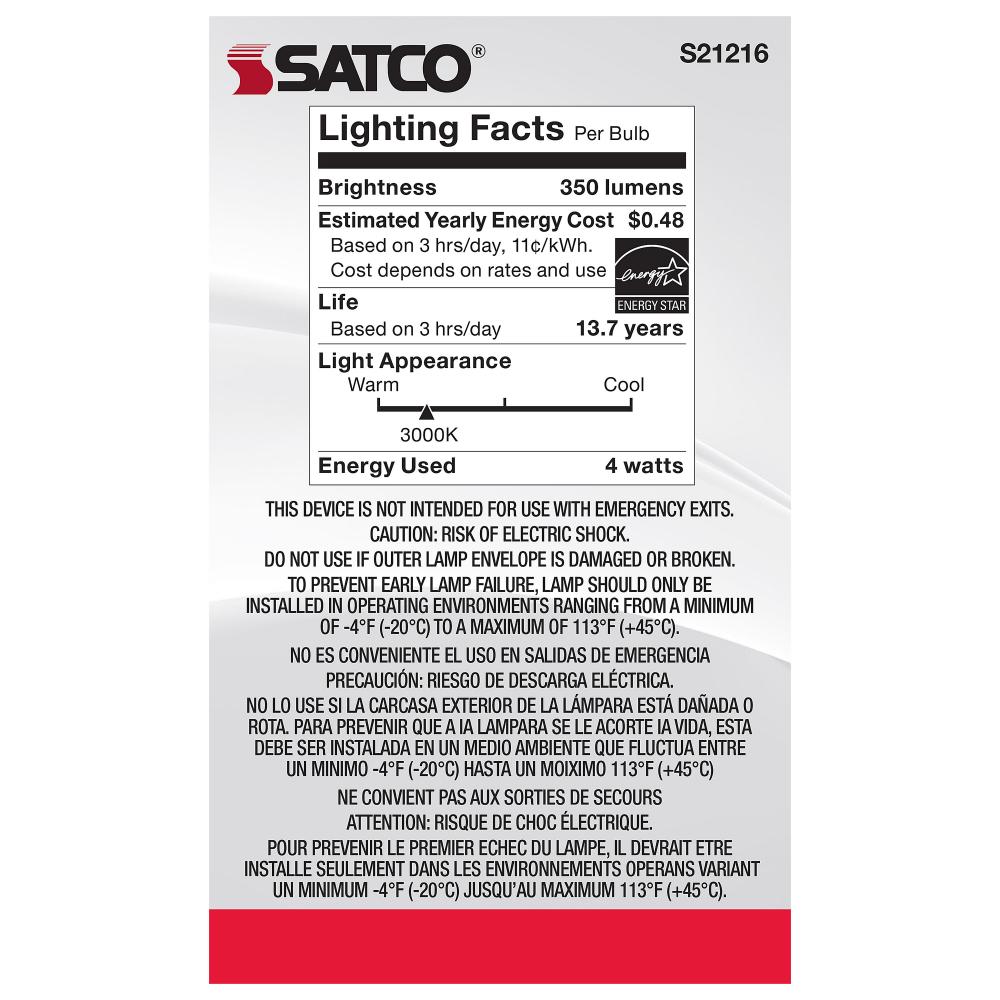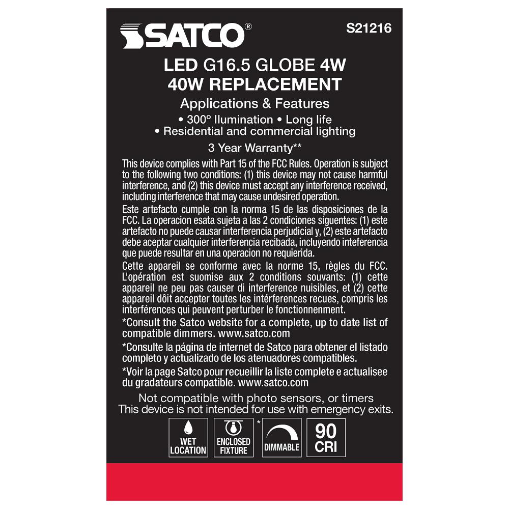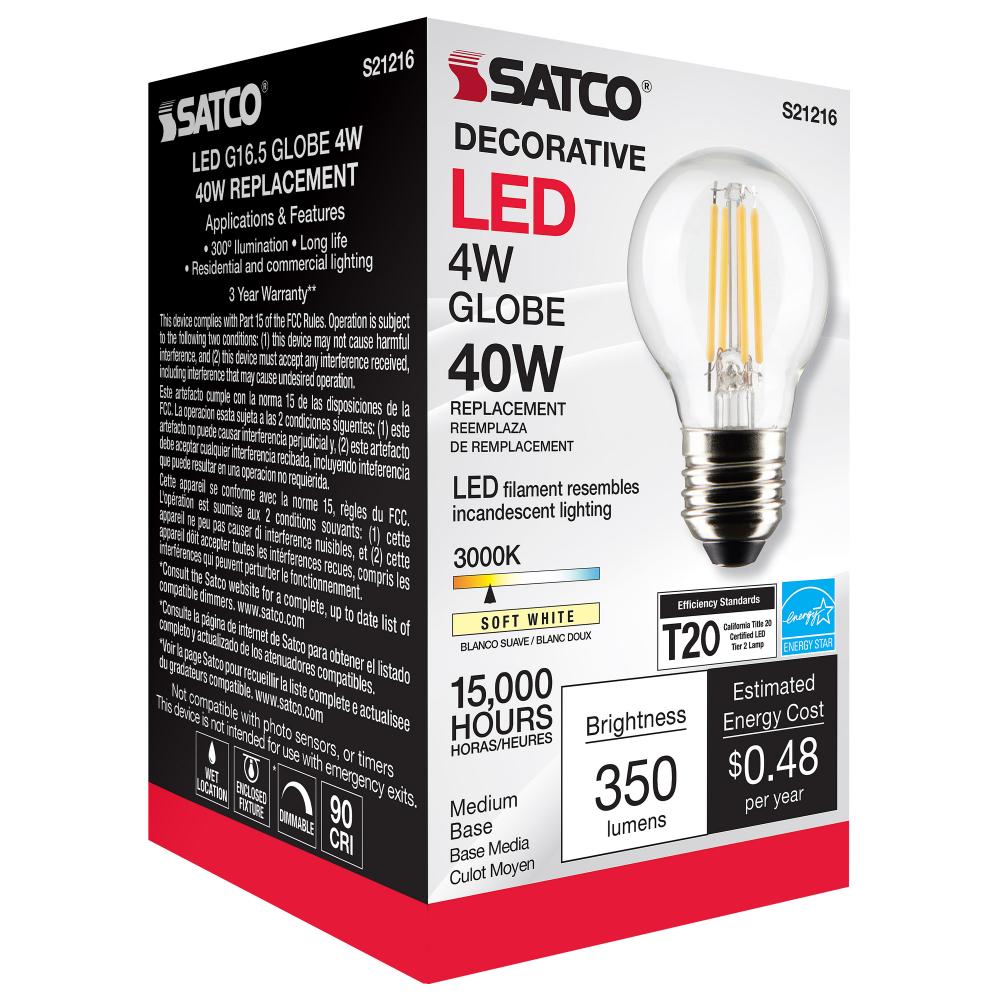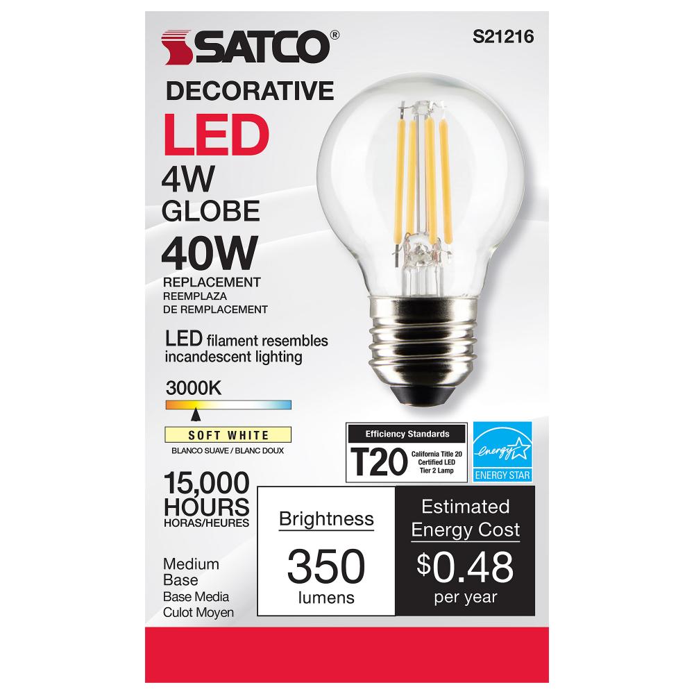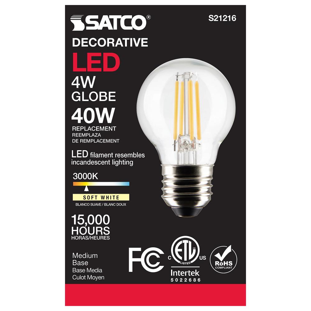 Satco's S21216 4-watt LED lamp is traditional, yet contemporary with its vintage style and energy saving LED technology. Elegantly illuminate any room in the house with this dimmable, globe shaped bulb. Sophisticated and modern, this lamp delivers 15,0