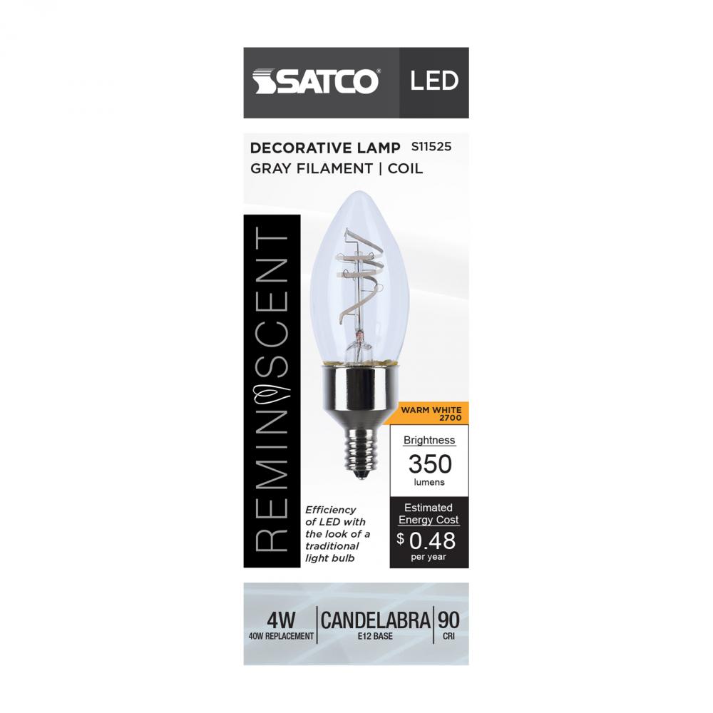 4 Watt LED; Reminiscent; Flex Gray Coil Filament; B11; Candelabra Base; 2700K CCT; Clear; 120 Volt