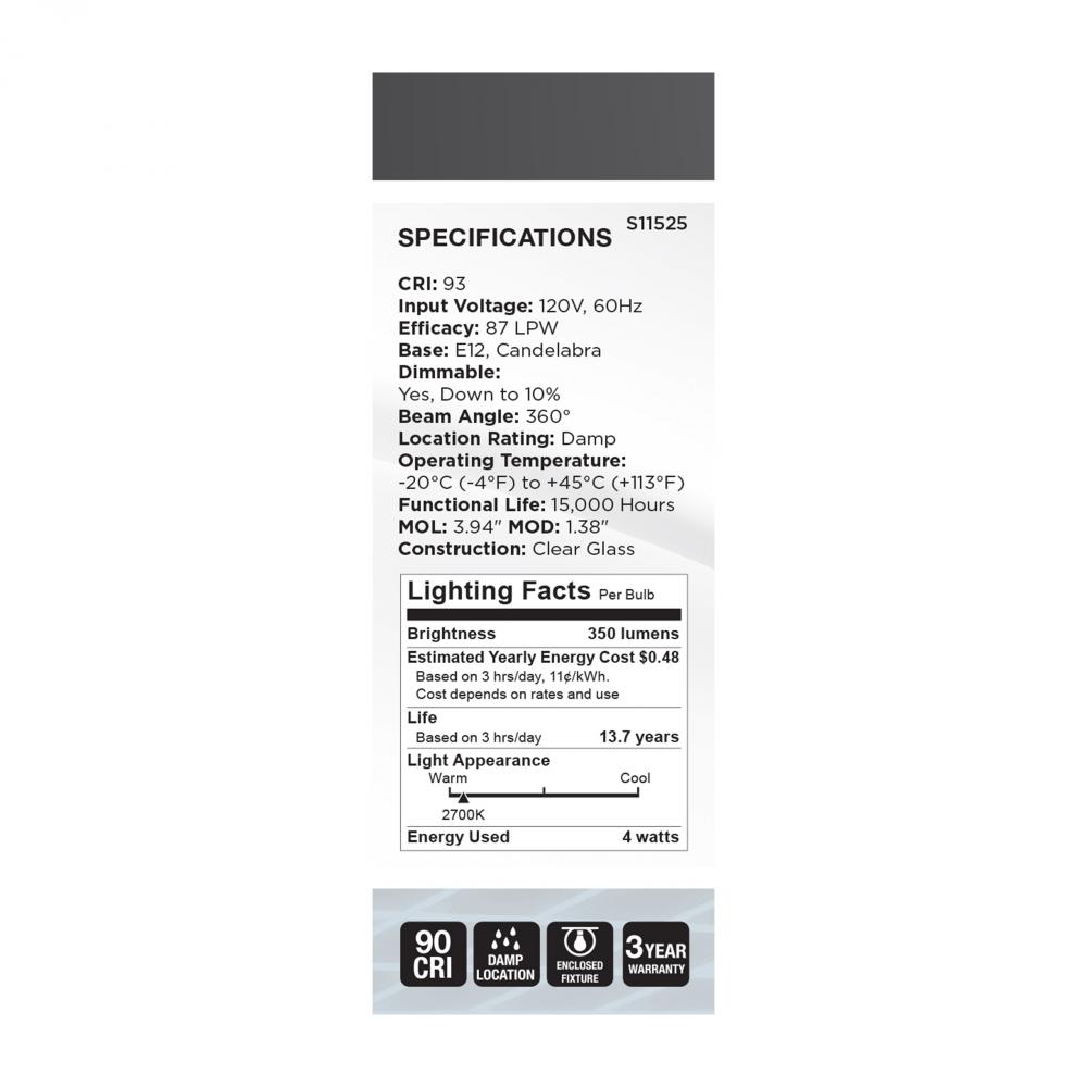 SATCO NUVO's S11525 B11 Reminiscent lamp offers the traditional look of tungsten filament bulbs with the energy savings of LED technology. The gray coil filaments provide a clean aesthetic, blending in with many current fixture and decor trends. With b