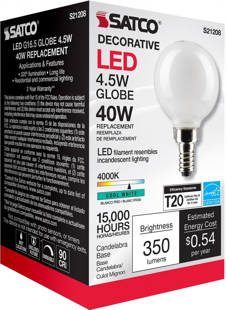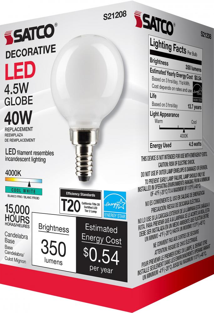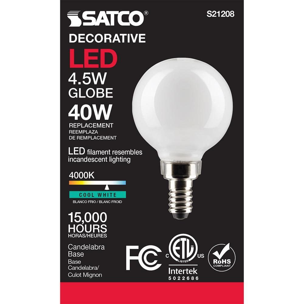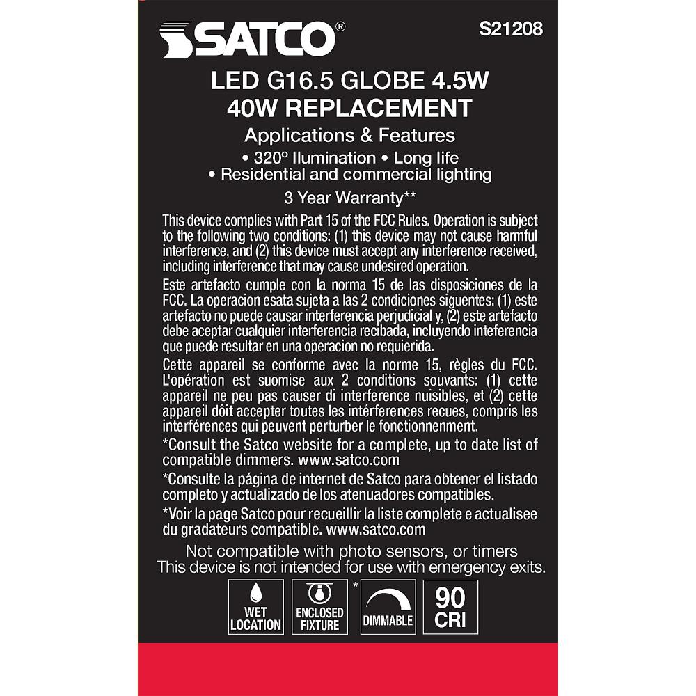 Satco's S21208 4.5-watt LED lamp is traditional, yet contemporary with its sleek finish and energy saving LED technology. Elegantly illuminate any room in the house with this dimmable, globe shaped bulb. Sophisticated and modern, this lamp delivers 15,