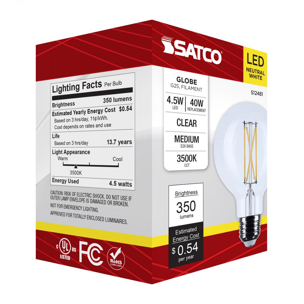 Satco's S12481 4.5-watt LED lamp is traditional, yet contemporary with its vintage style and energy saving LED technology. Elegantly illuminate any room in the house with this dimmable, globe shaped bulb. Sophisticated and modern, this lamp delivers 15