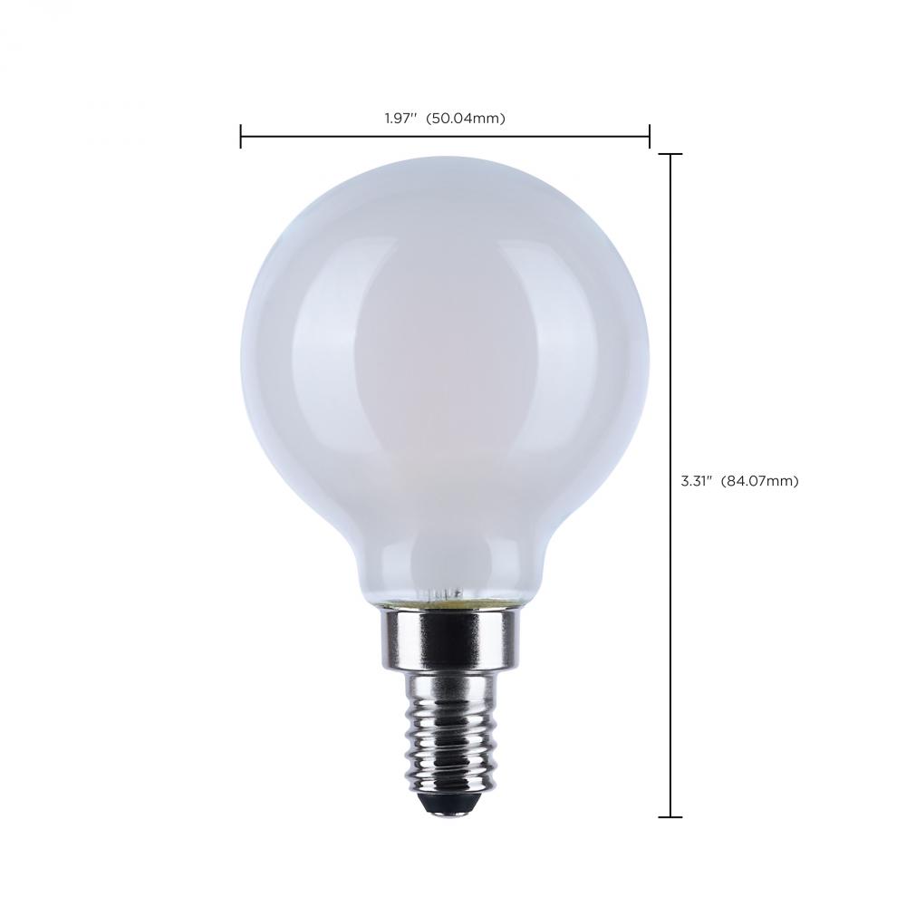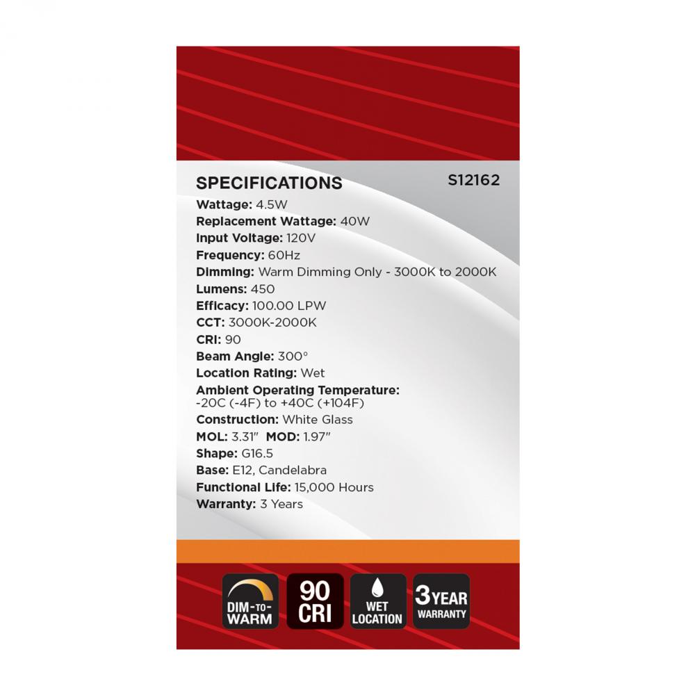 SATCO NUVO's S12162 G16.5 bulb offers Dim to Warm performance in a soft white finish that gently diffuses light. It transitions from 3000K to 2000K to create cozy, ambient lighting in decorative and hospitality settings. With a candelabra E12 base, 360