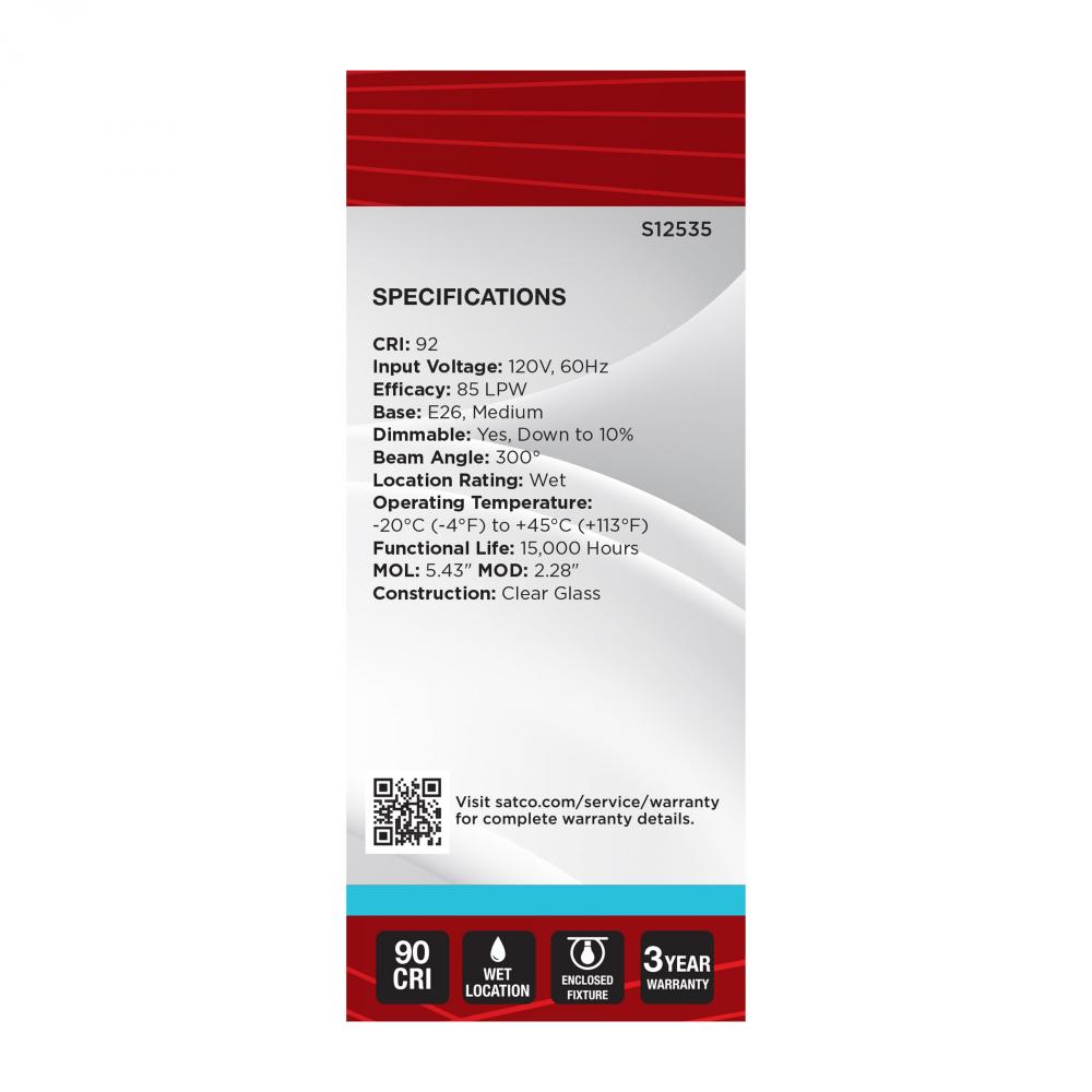Satco's S12535 5-watt, LED lamp is traditional, yet contemporary with its vintage style and energy saving LED technology. Elegantly illuminate any room in the house with this dimmable, clear bulb. Sophisticated and modern, this lamp delivers 15,000 hou