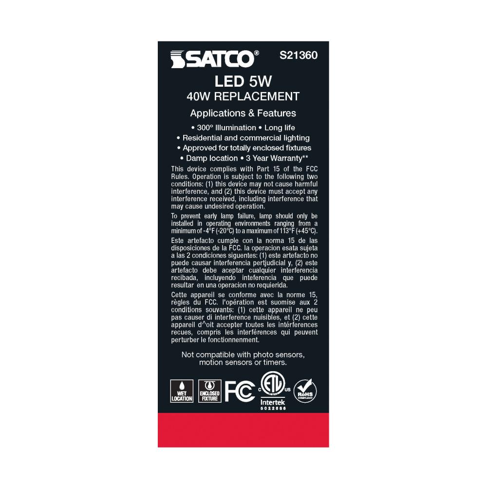 Satco's S21360 5-watt, LED lamp is traditional, yet contemporary with its vintage style and energy saving LED technology. Elegantly illuminate any room in the house with this dimmable, clear bulb. Sophisticated and modern, this lamp delivers 15,000 hou
