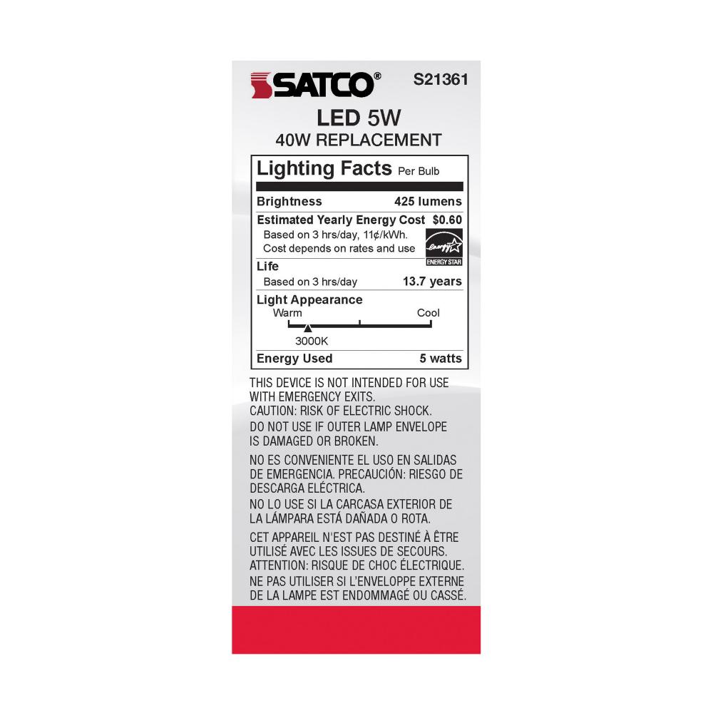 Satco's S21361 5-watt, LED lamp is traditional, yet contemporary with its vintage style and energy saving LED technology. Elegantly illuminate any room in the house with this dimmable, clear bulb. Sophisticated and modern, this lamp delivers 15,000 hou