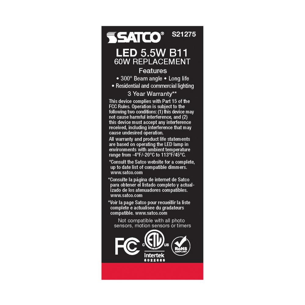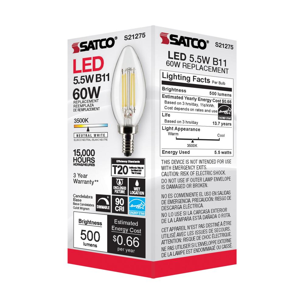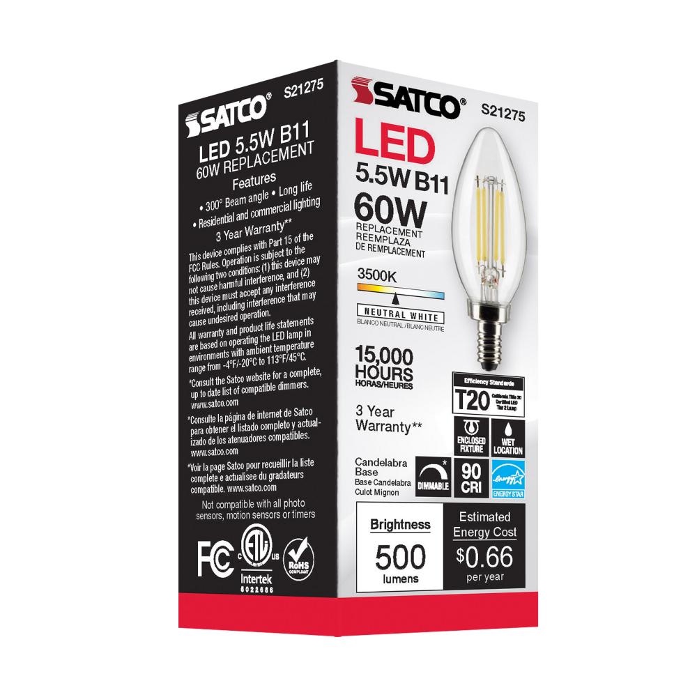 Satco's S21275 5.5-watt LED lamp is traditional, yet contemporary with its vintage style and energy saving LED technology. Elegantly illuminate any room in the house with this dimmable, clear bulb. Sophisticated and modern, this lamp delivers 15,000 ho