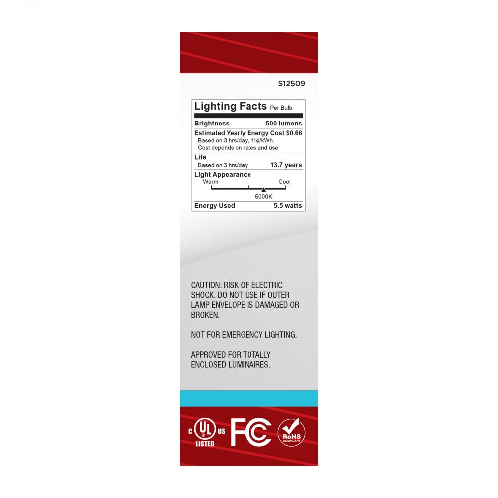 Satco's S12509 5.5-watt LED lamp is traditional, yet contemporary with its vintage style and energy saving LED technology. Elegantly illuminate any room in the house with this dimmable, clear bulb. Sophisticated and modern, this lamp delivers 15,000 ho